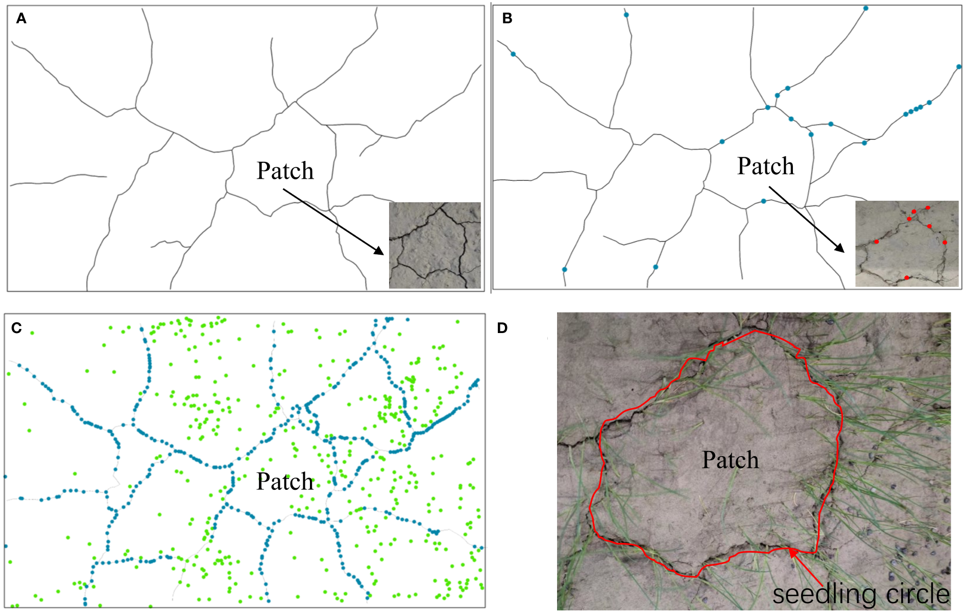 An illustration of the seedling colonization process. (A) Formation of mud cracks and patches. (B) Gradual colonization of mudflats along the mud cracks by individual seedlings. (C) Individual seedlings in mud cracks and patches. Green dots represent seedlings in the patches, and blue dots represent seedlings in the mud cracks. (D) A “seedling circle” formed at the end of the experimental period.