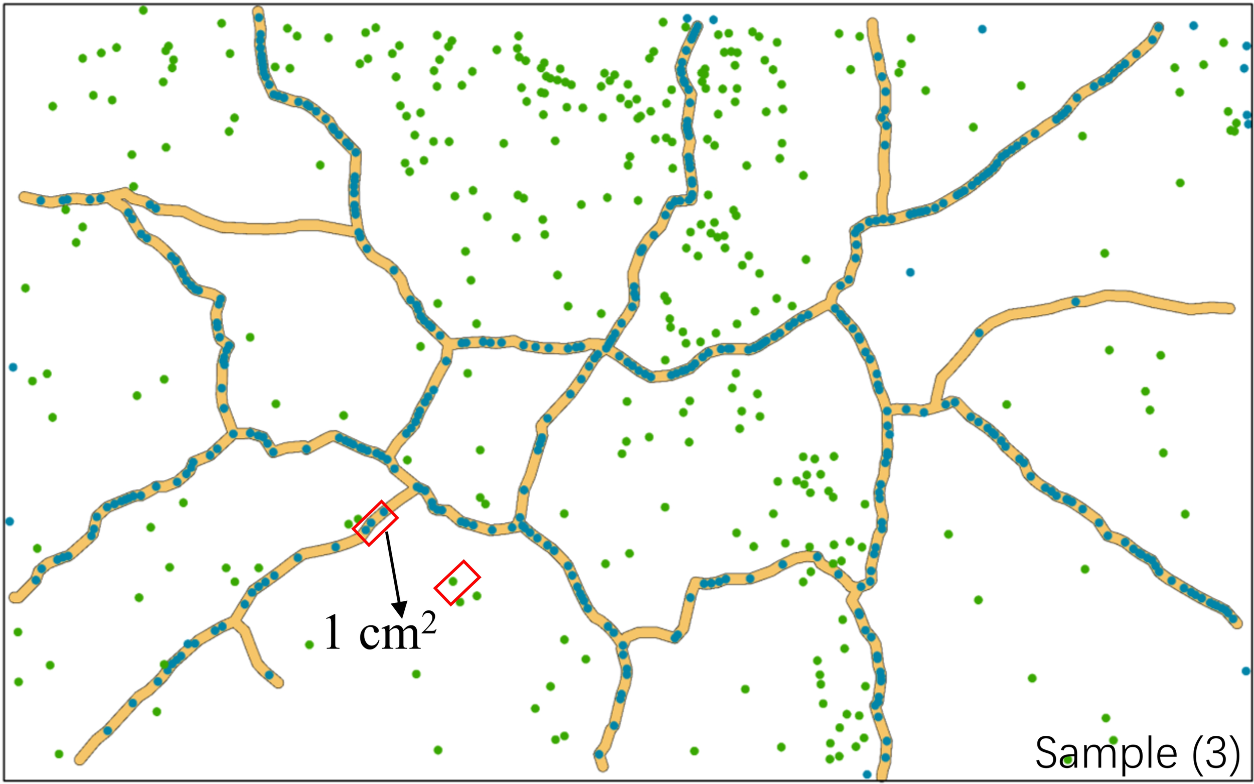 Variations in seedling densities between mud cracks and patches. The area marked in red represents one square unit (1 cm2). The image is from parallel sample 3.