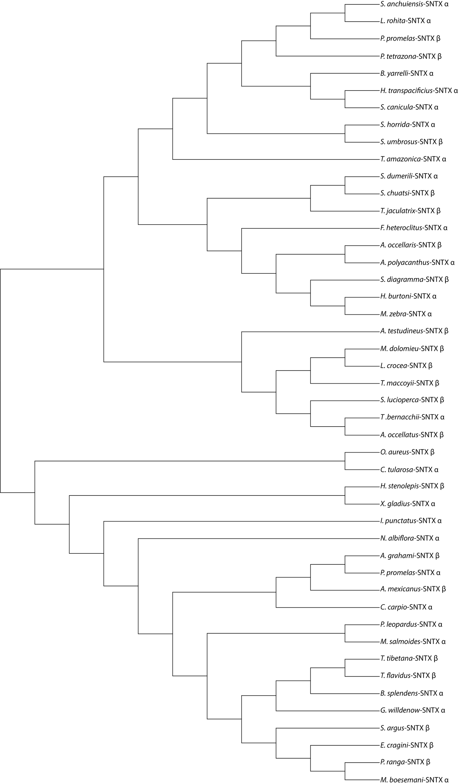 A phylogenetic tree showing representatives of some known venomous fishes that produces Stonustoxin (SNTX) as a venom bioactive compound. Sequences used to construct this phylogenetic tree were obtained from NCBI database. MEGA 11 software was used to construct this phylogenetic tree. Symbols α and β indicates the alpha and beta subunit of Stonustoxin. Full names of species and their accession numbers have shown in the table under Supplementary Material Table 1.