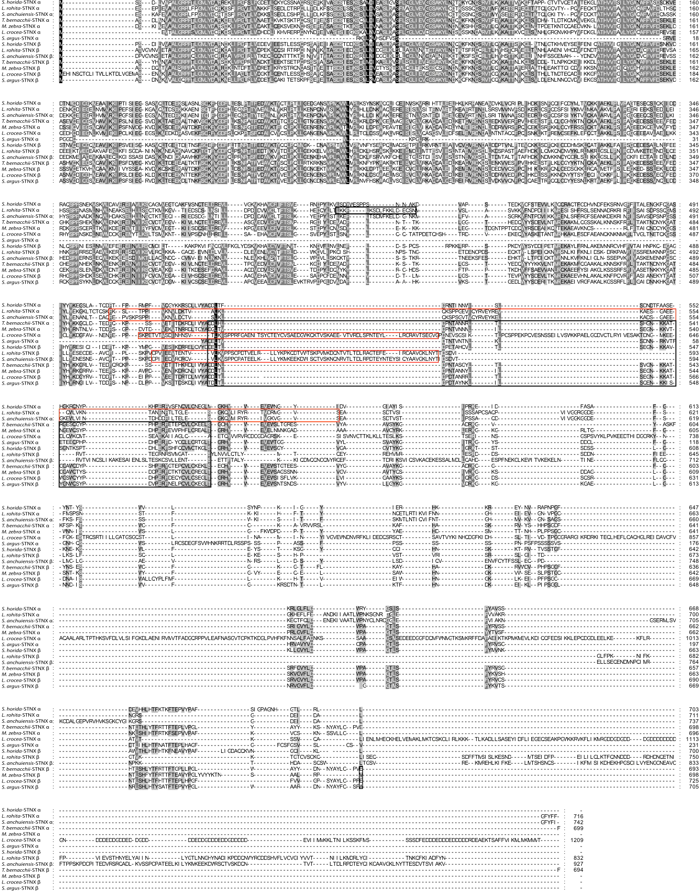 Sequence alignment of the α-subunit and β-subunit of Stonustoxin (SNTX) from some of venomous fish species. The FN3 domain is boxed in red borders. The PRY/SPRY domain are boxed in black borders. Amino acid numbers are shown on the right side and sequence discrepancies are highlighted in black and grey in a gradient based on similarity. Full names of species and their accession numbers from NCBI database have shown in the Table 1 under Supplementary Material.