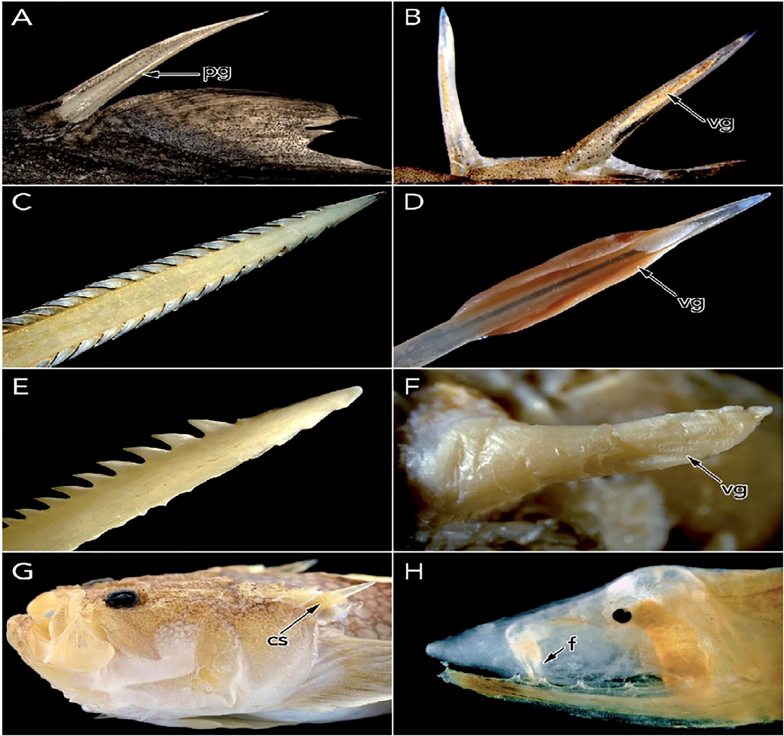 Representative venomous fish structure morphology: (A) Venomous dorsal spines from the lantern shark. (B) Venomous dorsal spine from the jack. (C) The barbed dorsal spine of the stingray. (D) The venomous dorsal spine with enlarged venom glands in the stonefish, (E) The barbed pectoral spine of the sea catfish. (F) The venomous opercular spine of the toadfish. (G) Cleithral spine of the stargazer. (H) The venomous fang of the one-jawed eel. Abbreviations: cs, cleithral spine; f, fang; pg, posterior groove; vg, venom gland. Source (Smith et al., 2016).