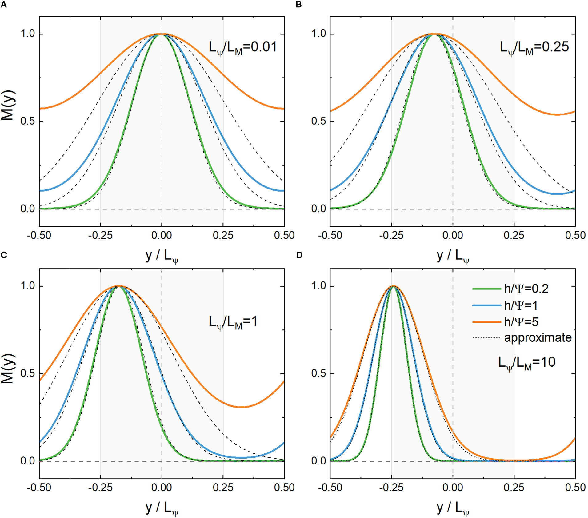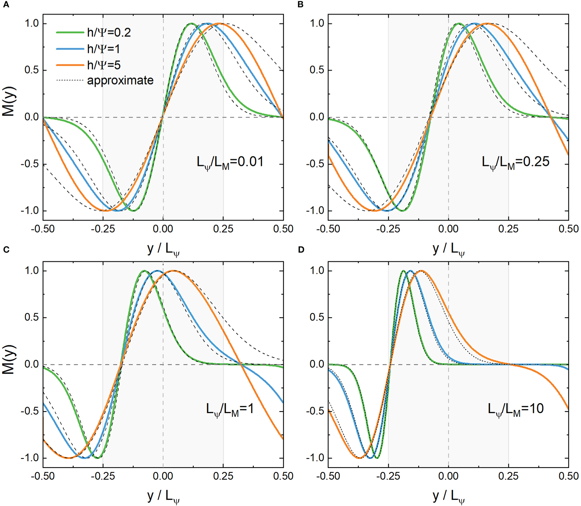Distribution of the even eigenfunction MC(ω,ξ,y) and its approximate solution near the core (y=0) (A, B) or boundary (y/LΨ=−1/4) (C, D) with the second lowest eigenvalues. Lψ/LM=kx/k0=0.01,0.25,1,10, , respectively. Shaded areas indicate negative vorticities.