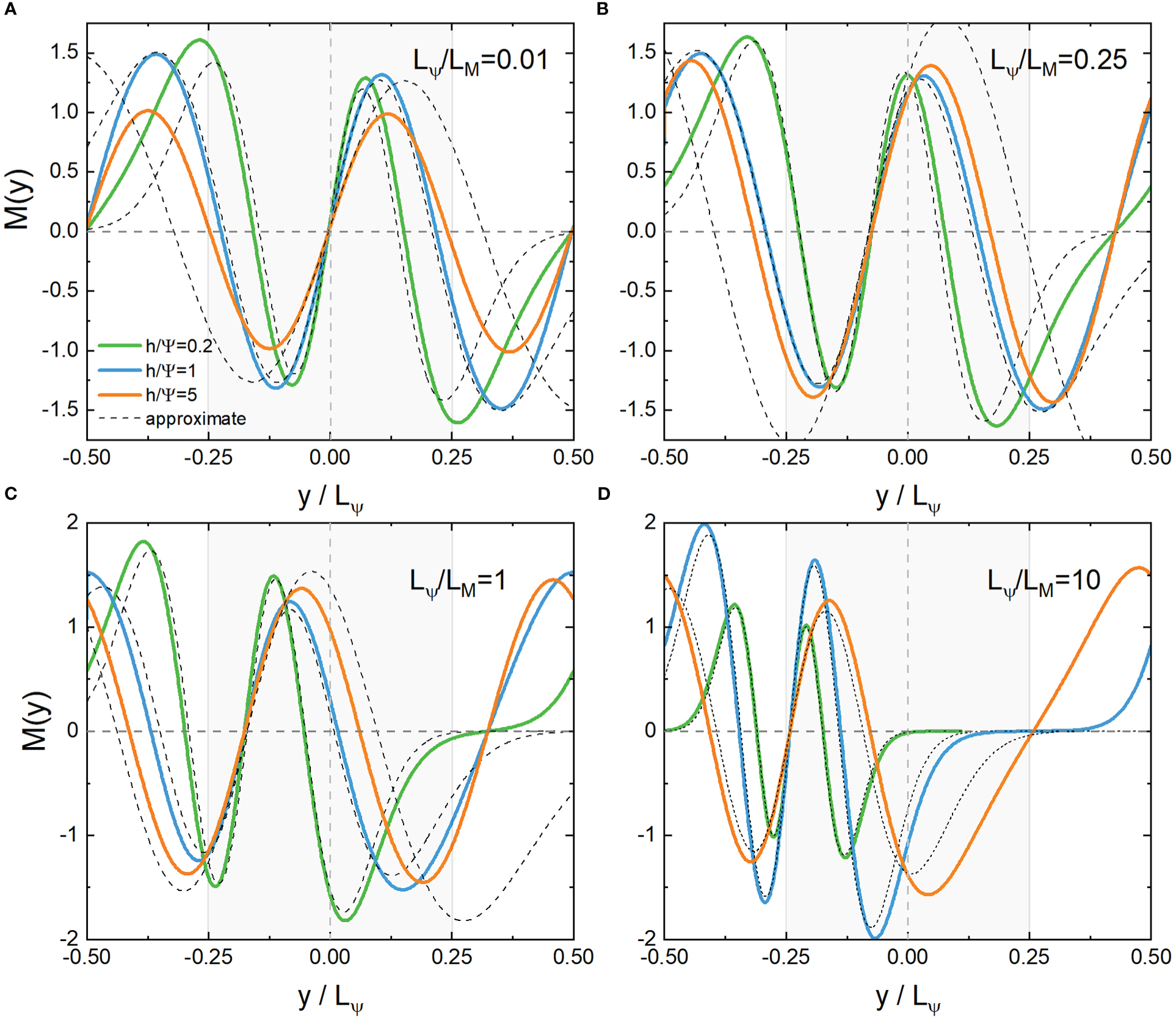 Distribution of the odd eigenfunction MS(ω,ξ,y) and its approximate solution near the core (y=0) (A, B) or boundary (y/LΨ=−1/4) (C, D) with the second lowest eigenvalues. Lψ/LM=kx/k0=0.01,0.25,1,10 , , respectively. Shaded areas indicate anticyclones.