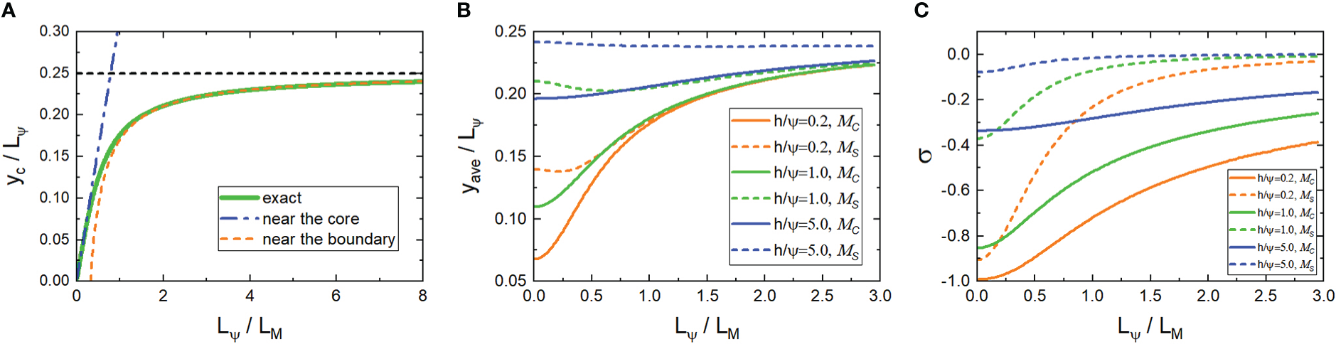 (A) The distance yc between the center of the waves and the core of the negative vorticity as a function of Lψ/LM , which is caused by the advection term. (B, C)yave/Lψ(B) and σ(C) vs Lψ/LM from the lowest eigenmodes of MC and MS with different h/Ψ=0.2,1,5, respectively.