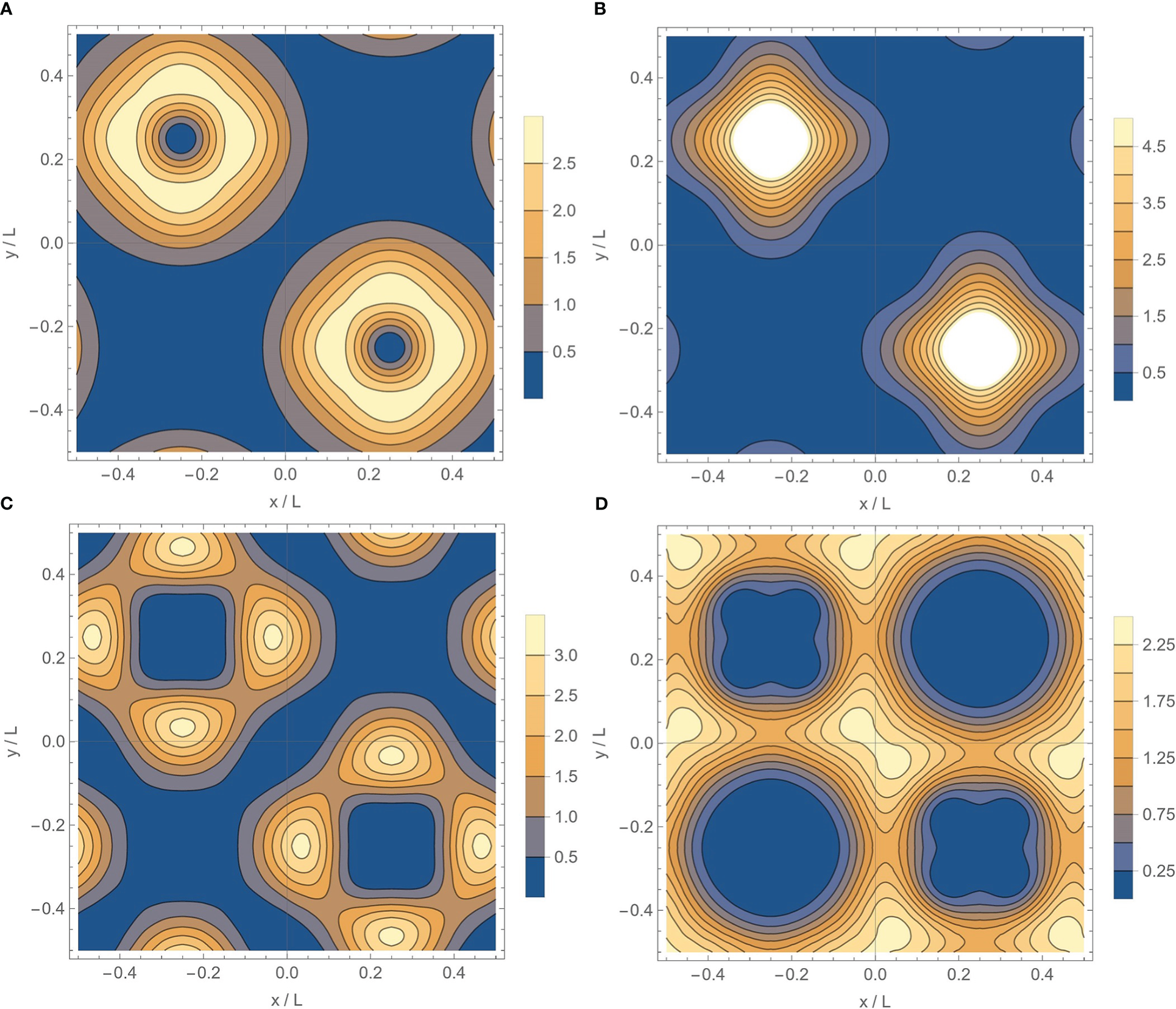 (A–D) Typical eigenmodes in the vortex quadrupole with order number n=1,4,8,9 , respectively. In (A, B), the NIWs concentrate in anticyclones; in (C) they concentrate near the boundaries; while in (D), they concentrate at the saddle points. h/Ψ=1 , L=Lψ=2π/k0.