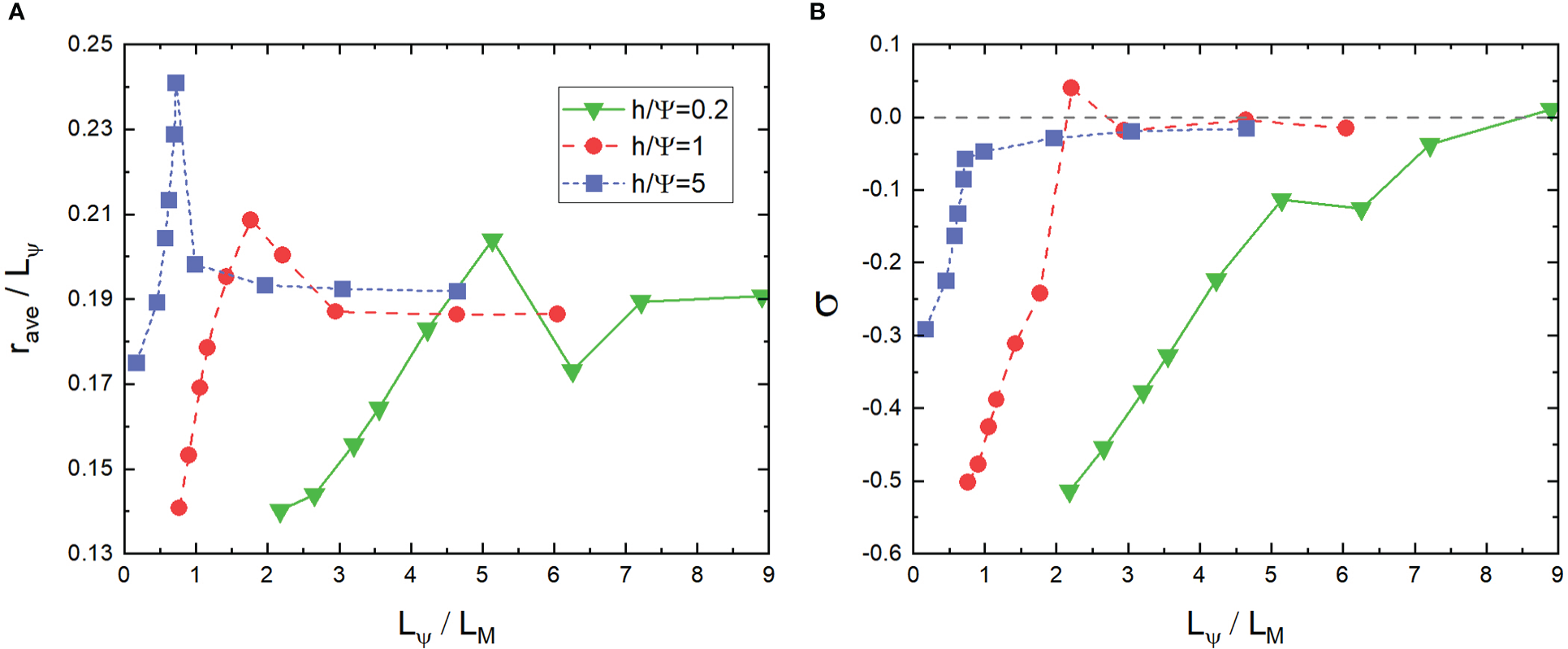 (A) r ave /Lψ vs Lψ/LM from the long-time average of M(x,y,t). (B)σ vs Lψ/LM from the long-time average of M(x,y,t). . h/Ψ=0.2,1,5, respectively.