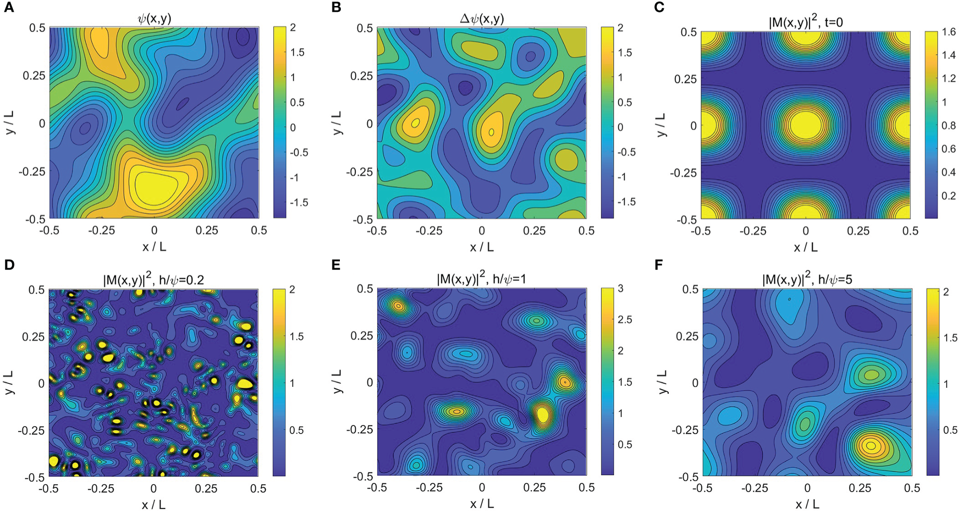 (A, B) Density plots of the random stream function (A) and associated vorticity field (B) with h/Ψ=1. (C) The initial condition for the velocity field, as set in Eq.(28) with n=1. (D–F) The long-time evolutionary behaviors of NIWs with different h/Ψ=0.2,1,5, respectively. The domain size is L=4π.