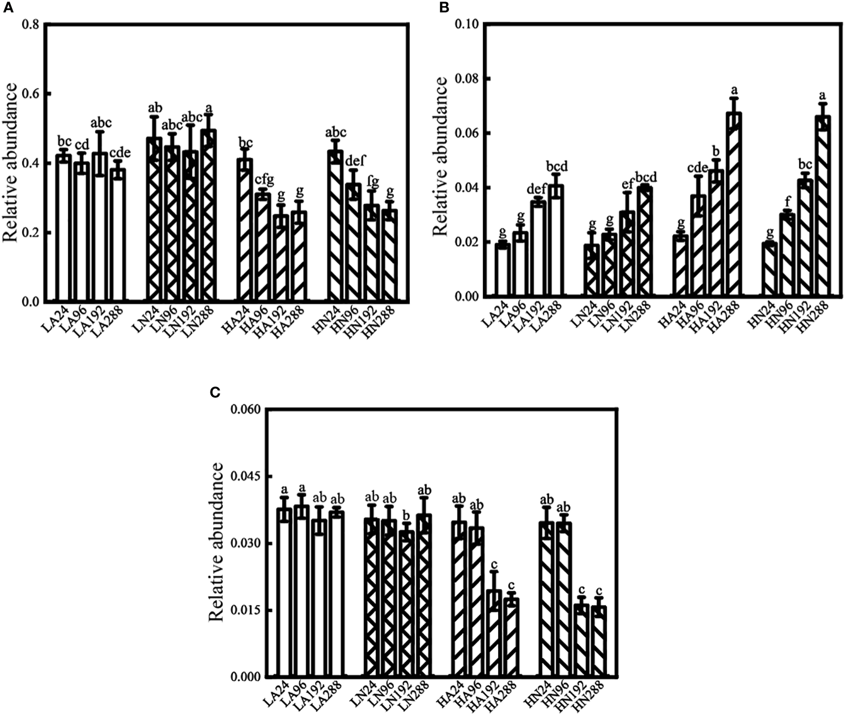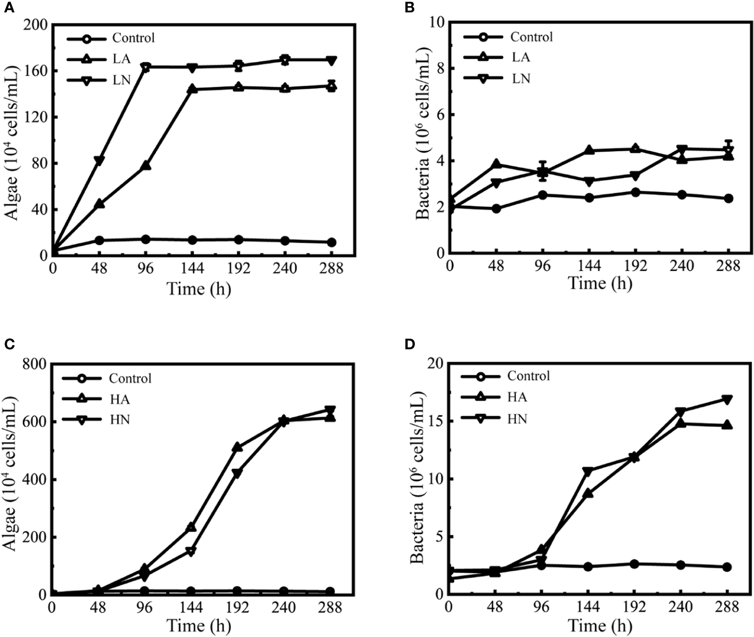 In conclusion, in the algal-bacteria consortium of this experiment, time and nitrogen concentration are the main factors that cause differences in phycosphere bacterial communities among treatment groups. In contrast, the nitrogen form has less of an effect. Under low nitrogen conditions (LA and LN), the bacterial community structure was different at times. Still, the distance between the bacterial community structures was closer than in the high nitrogen groups, showing that the bacterial community composition was more similar. Under high nitrogen conditions (HA and HN), the bacterial communities changed from 24 to 192 h, but they were similar after 192 h.