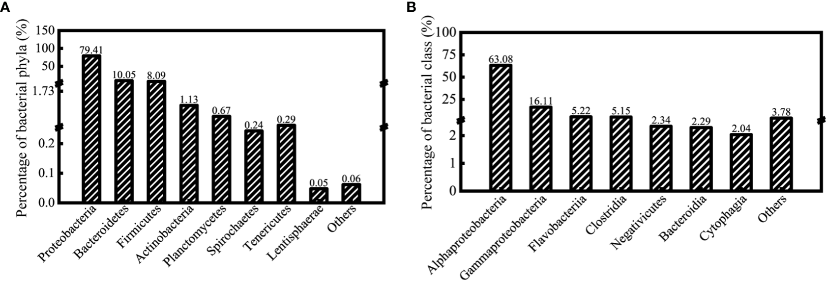 Based on the species annotation analysis of the SILVA database, the obtained 1468 OTUs were classified into 27 phyla, 53 classes, 115 orders, 175 families, 315 genera, and 119 identifiable species (the rest were unidentifiable species). The results demonstrated that the proportion of Proteobacteria in all treatment groups was the highest, accounting for 79.41% of all sequences, followed by Bacteroidetes and Firmicutes, which accounted for 10.05% and 8.09%, respectively. In Proteobacteria, Alphaproteobacteria and Gammaproteobacteria accounted for 63.08% and 16.11% of the total sequences, respectively, as shown in Figure 2.