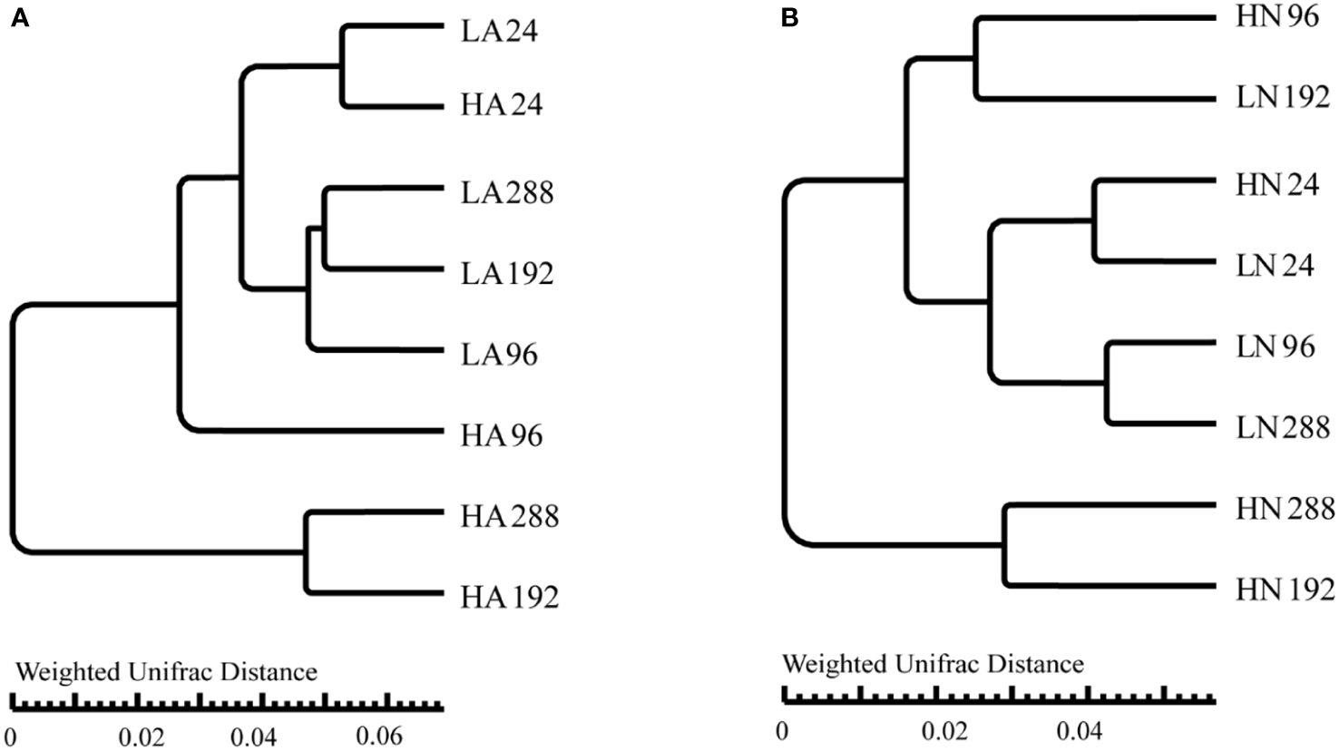 UPGMA analysis of different treatment groups under the algal-bacteria co-culture system, using the weighted Unifrac distance (each leaf represents three independent experiments). (A) UPGMA analysis of the comparison between the low concentration (LA) and the high concentration (HA) groups with ammonium. (B) UPGMA analysis of the comparison between the low concentration (LN) and the high concentration (HN) groups with nitrate.