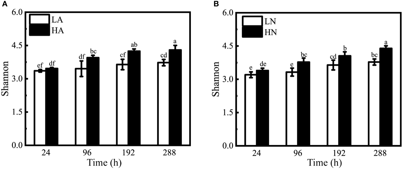 Shannon-Weaver indices of different treatment groups under the algal-bacteria co-culture system. (A) The comparison between the low concentration (LA) and the high concentration (HA) groups with ammonium. (B) The comparison between the low concentration (LN) and the high concentration (HN) groups with nitrate. Different lowercase letters indicate statistically significant differences.