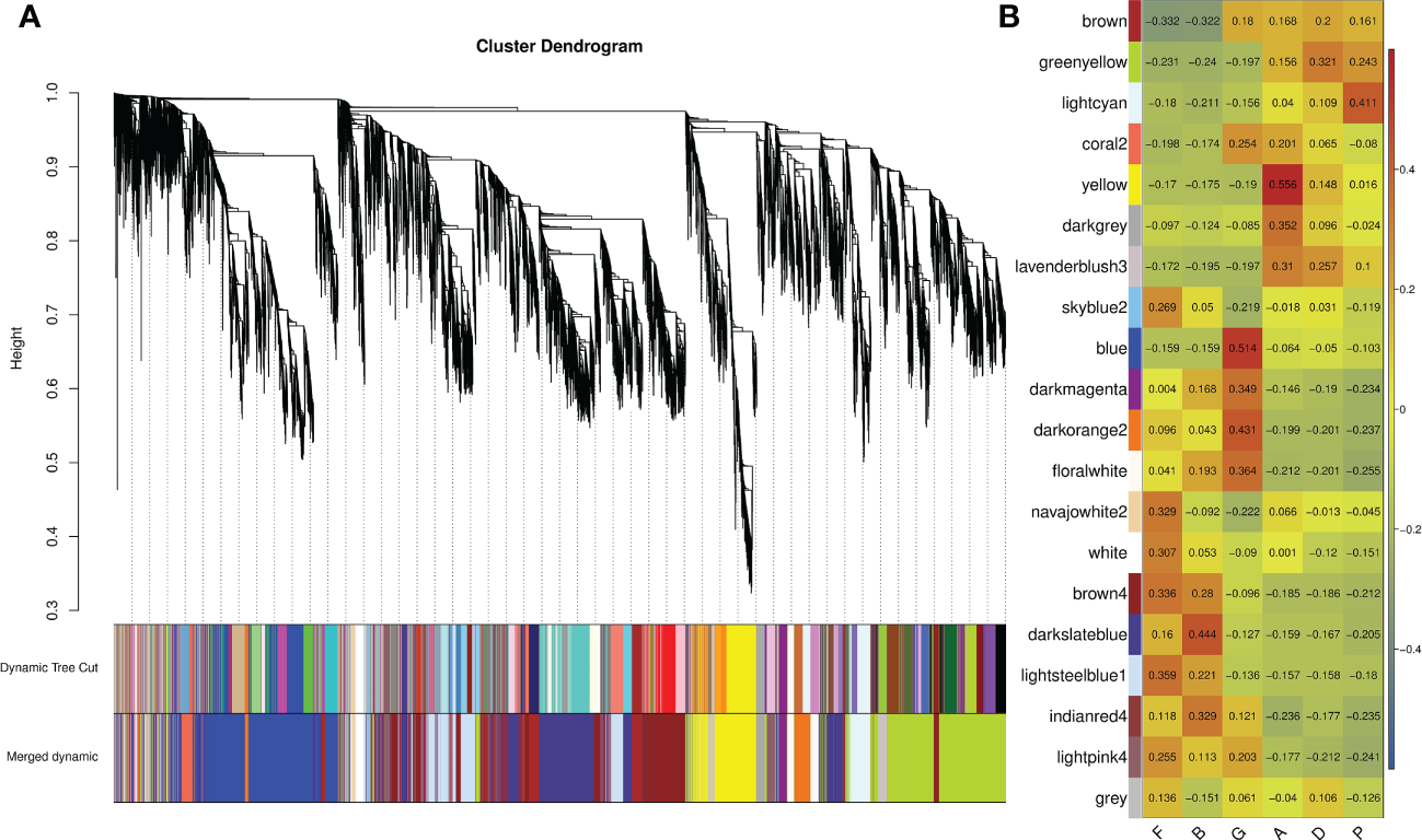 Weighted gene correlation network analysis (WGCNA) of all genes in different developmental stages. (A) Hierarchical cluster tree showing correlation modules identified by WGCNA. Each leaf in the tree represents one gene and each major tree branch represents one module, labelled with different colors. Modules with similar expression patterns are merged as merged dynamic. (B) Correlation matrix between modules and developmental stages. Red represents high expression and blue represents low expression.