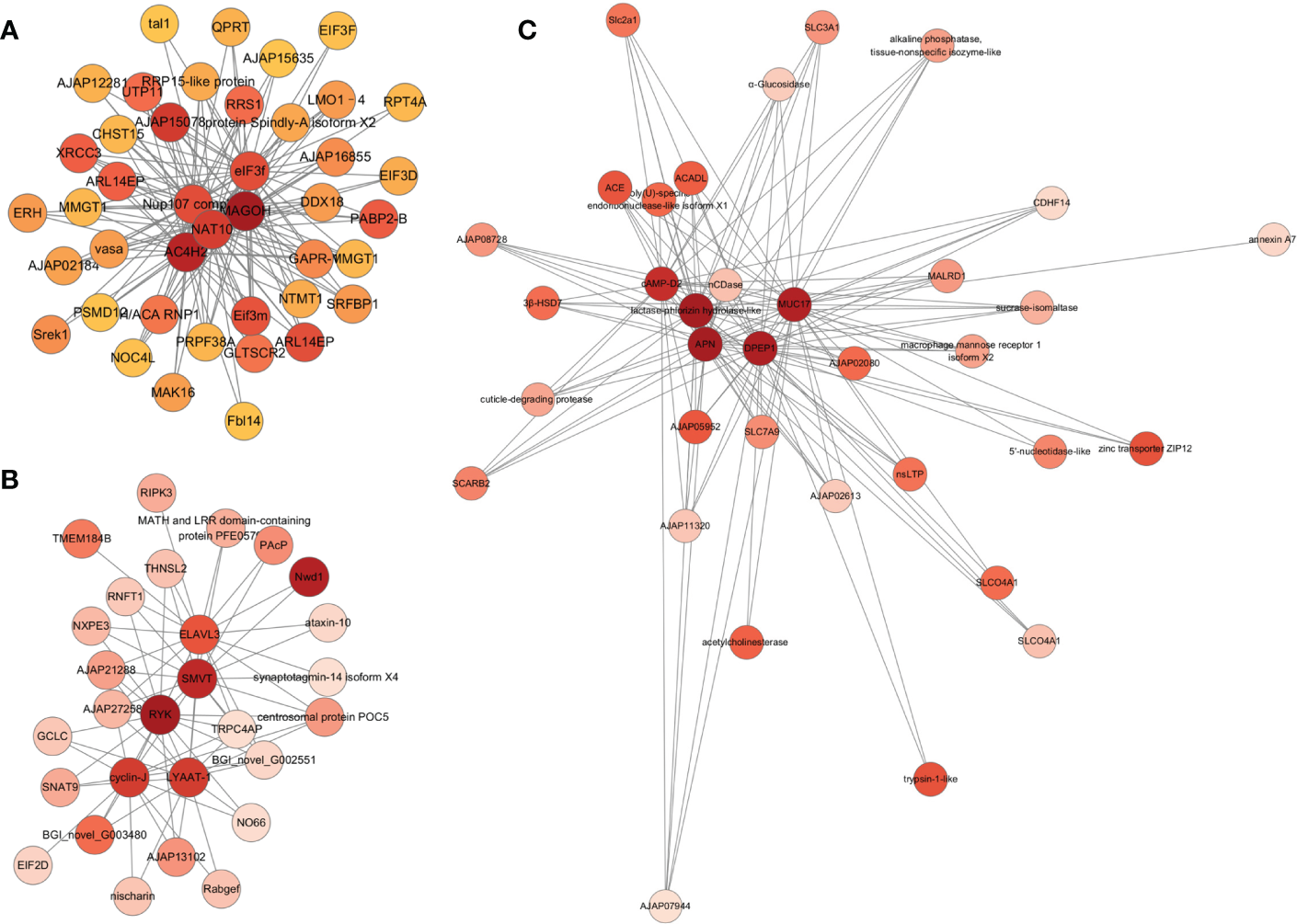 The correlation network of significantly enriched genes in the three target modules is illustrated in Figure 3. According to the target module size, the top five genes with the highest All.kWithin values were identified as hub genes (Table S9 in the supplementary material). In the correlation network of the blue module, protein mago nashi homolog (MAGOH), zinc finger C4H2 domain-containing protein-like isoform X1(AC4H2), N-acetyltransferase 10 (NAT10), nuclear pore complex protein Nup107 isoform X1 (Nup107 complex), and eukaryotic translation initiation factor 3 subunit F (eIF3f) were identified as hub genes (Figure 3A; Supplementary Table S9). MAGOH is one of the three core proteins of the exon junction complex (EJC), and is essential for the normal development of embryos and nerves (Asthana et al., 2022). AC4H2 plays a vital role in regulating nervous system development, and has already been identified in multiple species (May et al., 2015; Ma et al., 2017). NAT10 promotes cell proliferation and thereby participates in malignant transformation of various cancers. In addition, NAT10 is expressed in the central nervous system of the embryo (Guo et al., 2020). Nup107 complex is part of the Nuclear Pore Complex (NPC) structural scaffold and the role of the Nup107 complex in gene expression is not restricted to nucleo-cytoplasmic transport, but also participates in neural differentiation in vertebrates (Gonzalez-Aguilera and Askjaer, 2012). The first nerve cells were detected in the apical region of the epidermis in the late gastrula stage (Nakano et al., 2006). Thus, the blue module was closely related to neurological genesis. Genes for enzymes associated with digestion and immunity, such as lactase-phlorizin hydrolase-like, aminopeptidase N (APN), dipeptidase 1-like (DPEP1), mucin-17 isoform X2 (MUC17), and cAMP-regulated D2 protein-like (cAMP-D2) were identified as hub genes of the yellow module (Figure 3B, Table S9 in the supplementary material). During the auricularia stage, the digestive system begins to improve. For the darkslateblue module, tyrosine-protein kinase RYK isoform X4 (RYK), sodium-dependent multivitamin transporter (SMVT), lysosomal amino acid transporter 1 (LYAAT-1), cyclin-J, and ELAV-like protein 3 isoform X2 (elavl3) were identified as hub genes (Figure 3C, Table S9 in the supplementary material). RYK may be a co-receptor along with FZD8 of Wnt proteins, such as WNT1, WNT3, WNT3A and WNT5A. LYAAT-1 defines a subgroup of lysosomal transporters in the amino acid/auxin permease family (Sagne et al., 2001). These genes were involved in the transportation of substances and the cell cycle.
