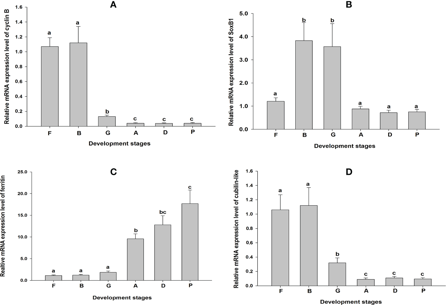 Validation of cyclin B (A), SoxB1 (B), ferritin (C) and cubilin-like (D) using RT-PCR. Data are shown as the mean ± SD. The lowercase letters indicate statistically significant differences (p < 0.05).