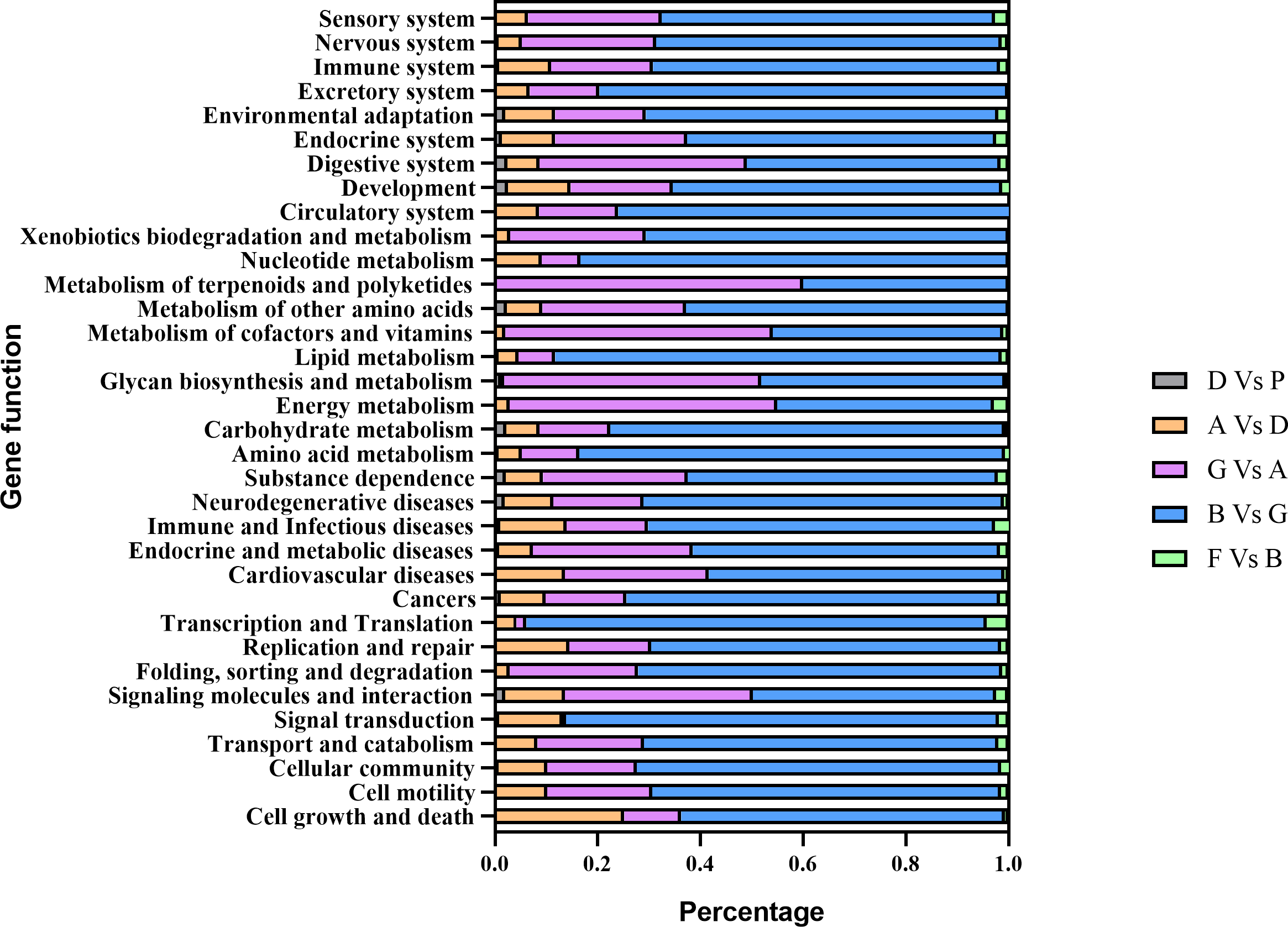 All DEGs could be categorized into 34 terms. “Signal transduction”, “Global and overview maps”, “Cancers”, “Endocrine system”, “Transport and catabolism”, “Infectious diseases: Viral”, “cellular community”, “Translation”, “Digestive system”, and “Signaling molecules and interaction” were the 10 most enriched terms during the entire development process of sea cucumbers (Supplementary Figure S1). Among almost all terms, the number of DEGs in the B Vs G comparison group was the largest, followed by the G Vs A comparison group (Figure 6), thus, there was strong gene expression regulation from blastula to auricularia. Compared with other pathways, the AVsD comparison group had the largest proportion in “cell growth and death”.