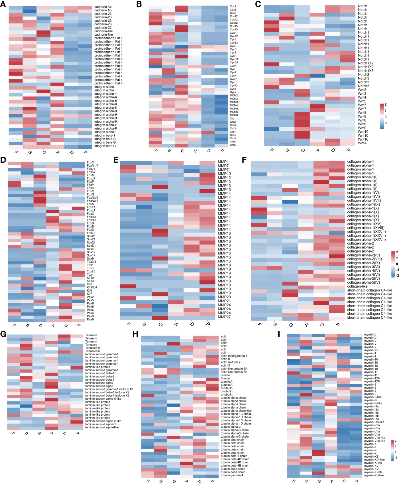 Heatmap diagram showing the expression levels of transcripts annotated as adhesion genes (A), cell cycle genes (B), signal genes (C), transcription factor (D), ECM genes (E–G) and cytoskeleton genes (H, I).