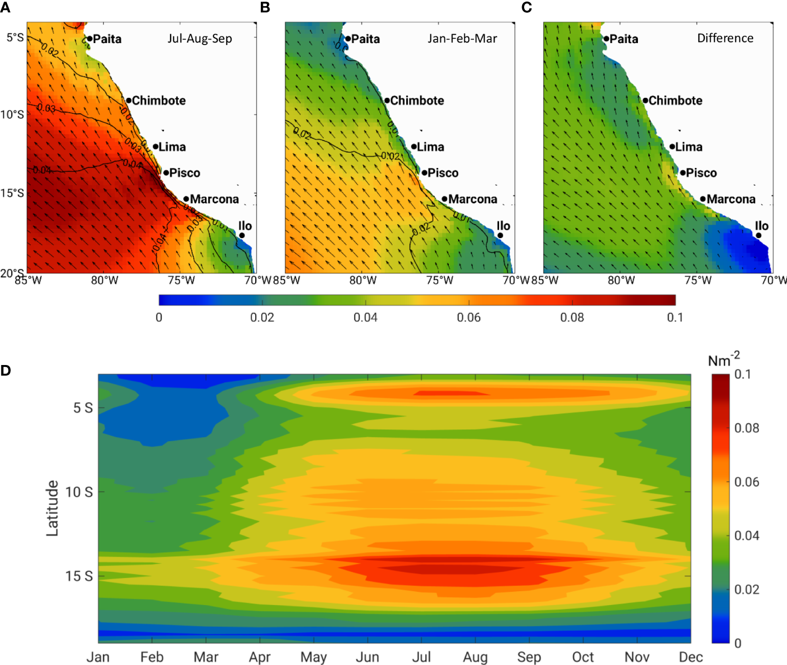The timing, duration, and intensity of upwelling-favorable winds across the PUS are modulated by the intensity and displacement of the South Pacific atmospheric anti-cyclonic system, which is largely affected by modes of climate variability such as the El Niño Southern Oscillation (ENSO), and the Interdecadal Pacific Oscillation (IPO) (Bakun, 1990; Montecinos et al., 2003; García-Reyes et al., 2015; Barros et al., 2014; Bakun et al., 2015). Several studies investigated the effects of climate change on EBUS functionality (Bakun, 1990; Narayan et al., 2010; Echevin et al., 2011; Belmadani et al., 2013; Jacox et al., 2014; Bakun et al., 2015; Rykaczewski et al., 2015; Varela et al., 2015; Oyarzún and Brierley, 2019; Taboada et al., 2019). In a conceptual notion, Bakun (1990) hypothesized that global warming would very likely continue causing enhanced continent–ocean surface atmospheric pressure gradient. With more signature in warm seasons of the year, the alongshore (equatorward) winds across the major EBUS are intensified, and consequently, the upwelling intensity is enhanced. He showed that the observed wind stress (τ) in the Peruvian coastal area (4.5°S–14.5°S) underwent an upward trend during 1945–1985 (Figures 1D, E in Bakun, 1990).