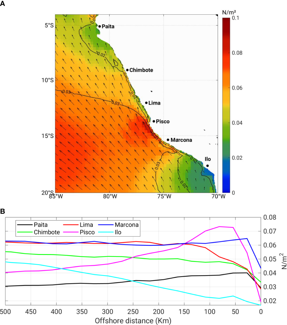 (A) Mean surface τ (color shading; N/m2), direction (arrows, every third vector shown), and its variability (contours; N/m2) across the Peruvian upwelling system. The variability was computed as the standard deviation of daily mean values. (B) Zonal profiles of the long-term mean τy for different upwelling cells across the PUS. The curves were obtained from the meridional average over a 1.0° band from the coastline to 500 km offshore distance in a zonal direction.