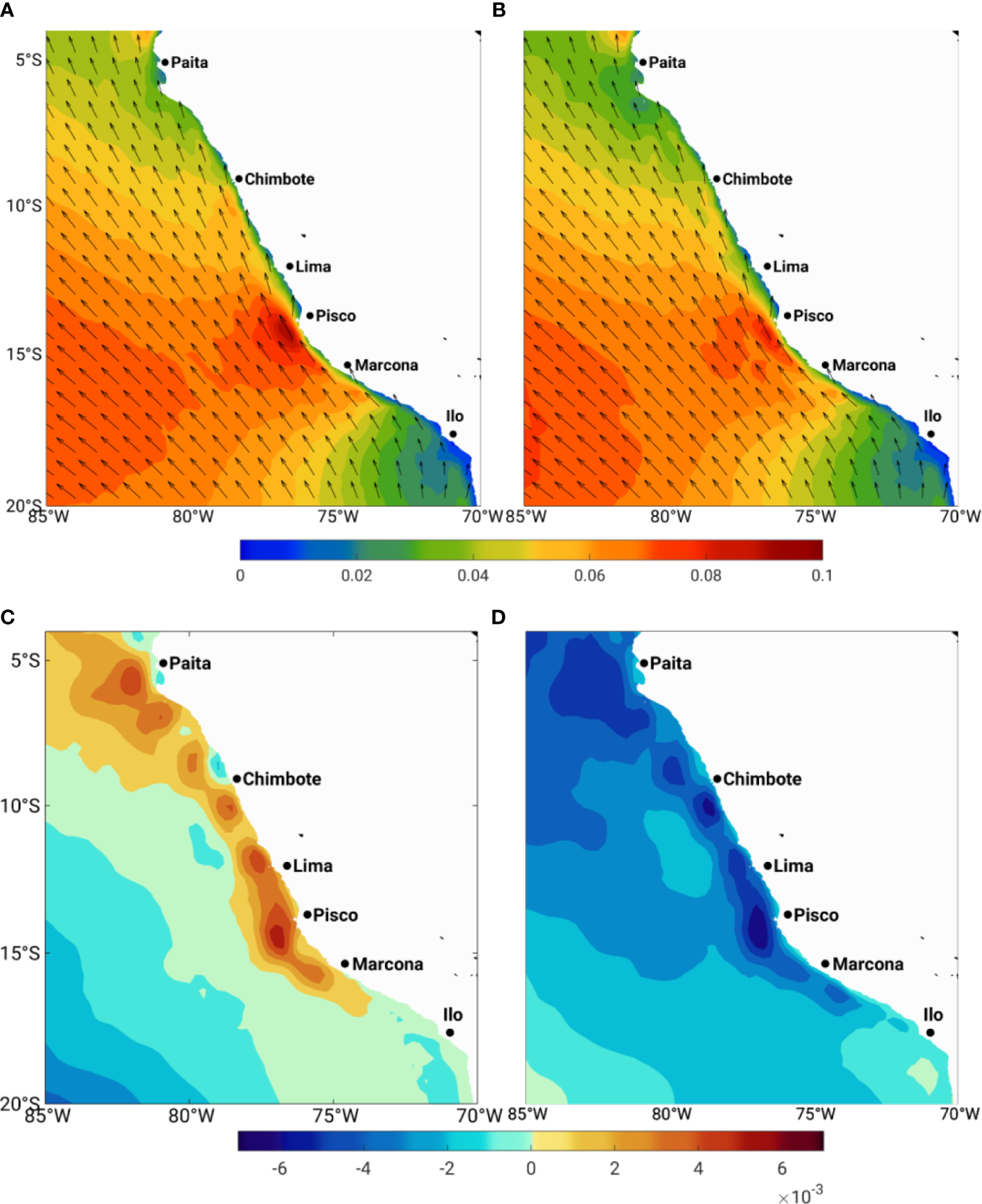 Mean τ (N/m2) for El Niño and direction (arrows, every third vector shown) (A) and its difference from the mean state (C), and La Niña and direction (arrows, every third vector shown) (B) and its difference from mean state (D) off Peru. It is obtained from ERA5 wind data from 1950 to 2019.