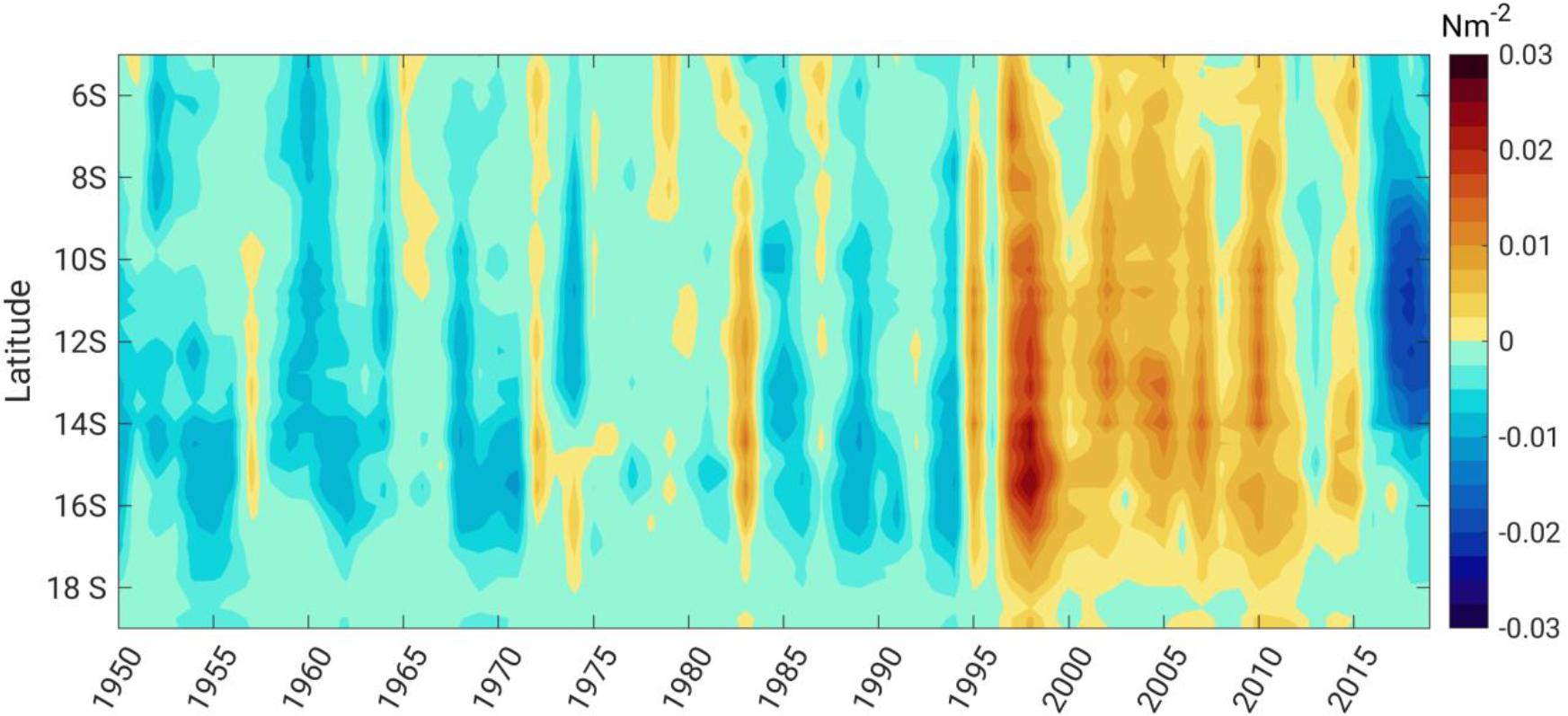 We applied low pass filters (1- and 5-year running average) to the time series of monthly mean alongshore τ anomalies over the coastal stripe of the Peruvian coast (5S–18S) (Figure 5). The presence of fluctuations in interannual and interdecadal timescales in the time series is evident. The interannual fluctuation of the wind stress is in phase with ENSO cycles. The same is true for the long-term fluctuations of τ and the IPO cycle, but they are out of phase. The pronounced shift from negative to positive τ anomalies in 1996 and from positive to negative in 2015 is apparent in the time series, which is in good agreement with IPO phase transitions. The negative phase of the IPO, which is a basin-wide La Niña-like pattern, is observed concurrent with the positive wind stress anomalies. This is also true for the period from 1975 to 2019.