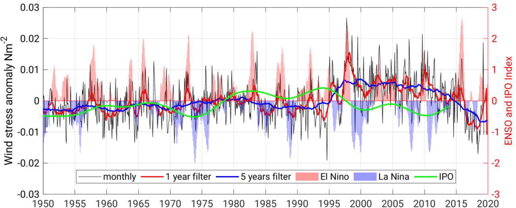 Anomaly of mean monthly (black curves), 1-year (red curve), and 5-year (blue curve) running means of alongshore wind stress across the PUS (coastal stripe over 5S–18S). The time series of the IPO index is shown by green lines. Red and blue shadings indicate El Niño and La Niña events, respectively. Note that alongshore wind stress is averaged over a coastal distance of 100 km.