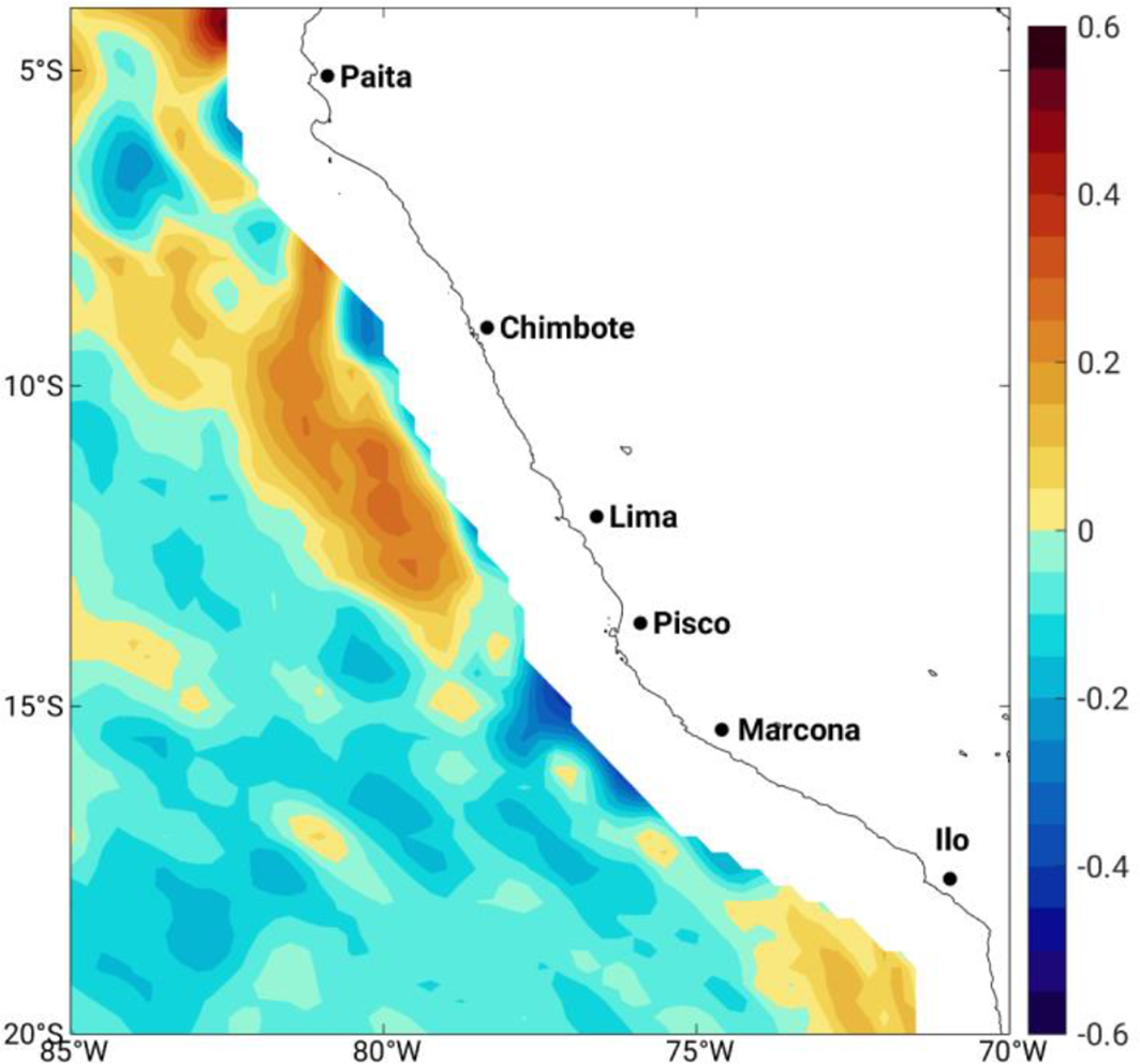 To investigate the influence of El Niño and La Niña on the meridional wind stress, we regressed the monthly mean wind stress onto the monthly ENSO index. It shows higher coefficients off the upwelling cells with a maximum of 0.42 in the Pisco area (Figure 8). This coefficient is particularly larger off the Pisco cell. We additionally applied the regression for the El Niño and La Niña episodes separately. The coefficients are 0.61 and 0.28 for El Niño and La Niña, respectively. The El Niño and La Niña events are decomposed based on the SST anomalies over the Nino3.4 index. The anomalies larger (smaller) than 1.0 (−1.0) are considered El Niño (La Niña) events. During El Niño, wind over the coastal zones is intensified, which is more pronounced off Pisco, Lima, Chimbote, and Paita. The weakening of the wind over the coastal zone is evident during La Niña. However, the impact of La Niña appears to be not mirror-like of El Niño. For example, wind over the central and southern portion of the PUS appears to be anti-correlated with the Nino3.4 SST during La Niña. In contrast, the wind over these sectors is marginally affected by the Nino3.4 SST during El Niño. It reminds the asymmetric features of ENSO cycles. Overall, coastal upwelling is more affected during warm (i.e., El Niño) than cold (i.e., La Niña) episodes.
