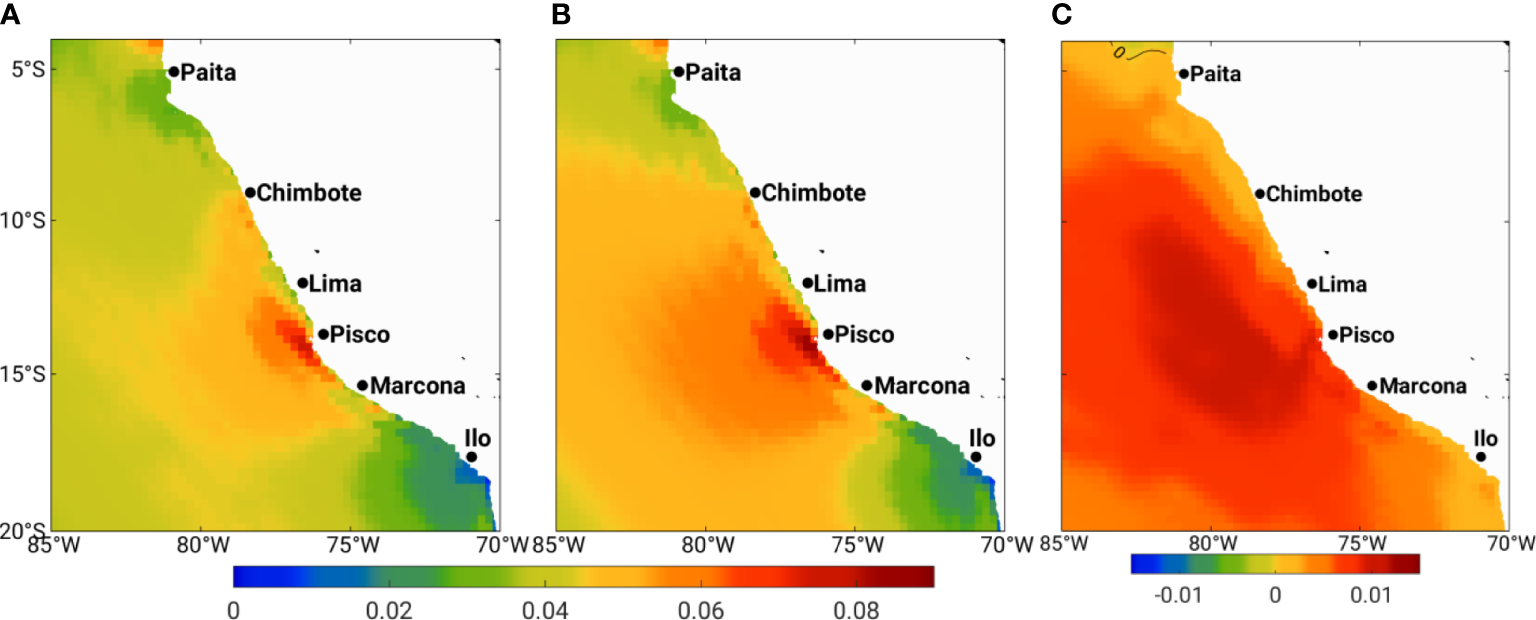 The long-term trend of meridional wind stress over the coastal domain and offshore areas shows a positive trend. The climatological mean over the periods of 1950–1979 and 1990–2019 and the difference between the two periods are shown in Figure 9. The distribution of trend (Figure 9C) shows positive values in almost all areas except the northernmost of the domain (above 5°S) with the maximum value in the Pisco area. The long-term wind intensification across the PUS can be largely attributed to the strengthening and southwest migration of the Pacific Subtropical Anticyclone (Ancapichún and Garcés-Vargas, 2015). Detailed information on the connection between the Pacific subtropical anticyclone and wind-driven upwelling across the PUS would be very beneficial for improving regional decadal prediction, which is beyond the current study.