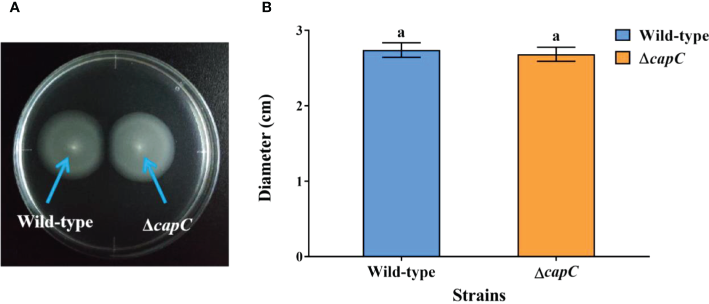 The swimming motility of ΔcapC strain was not significantly different from P. marina by observing (Figure 3A) and calculating the formation of the migration zone (p > 0.05, Figure 3B).