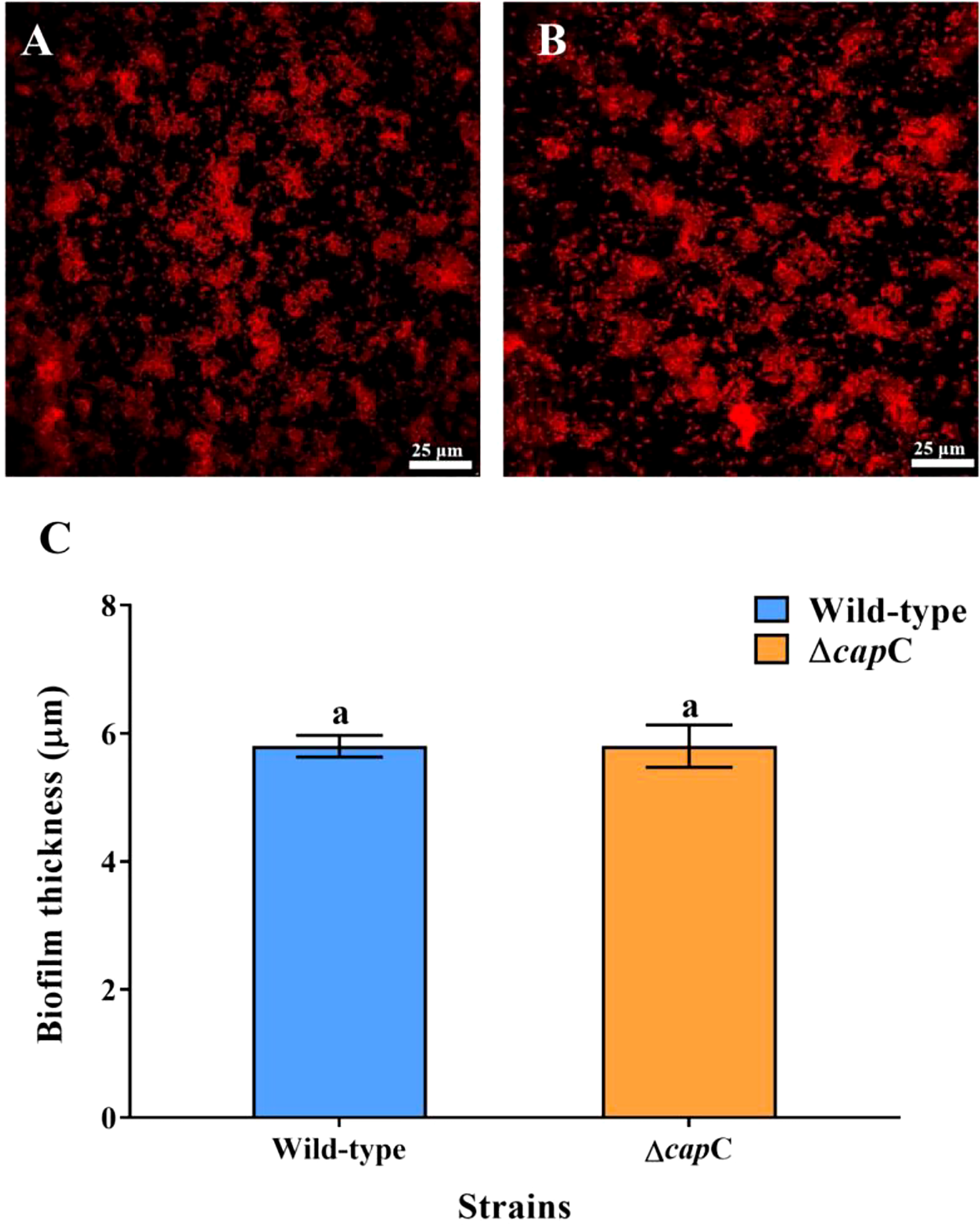 Biofilm-forming ability of experimental strains. (A, B) The CLSM images of wild-type and ΔcapC biofilms. (C) Quantitative results of biofilm thickness of wild-type and ΔcapC biofilms.