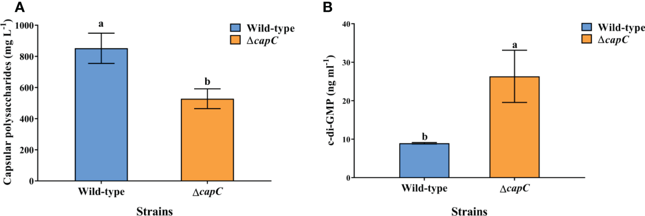 Difference in CPS secretion (A) and c-di-GMP (B) of experimental strains.