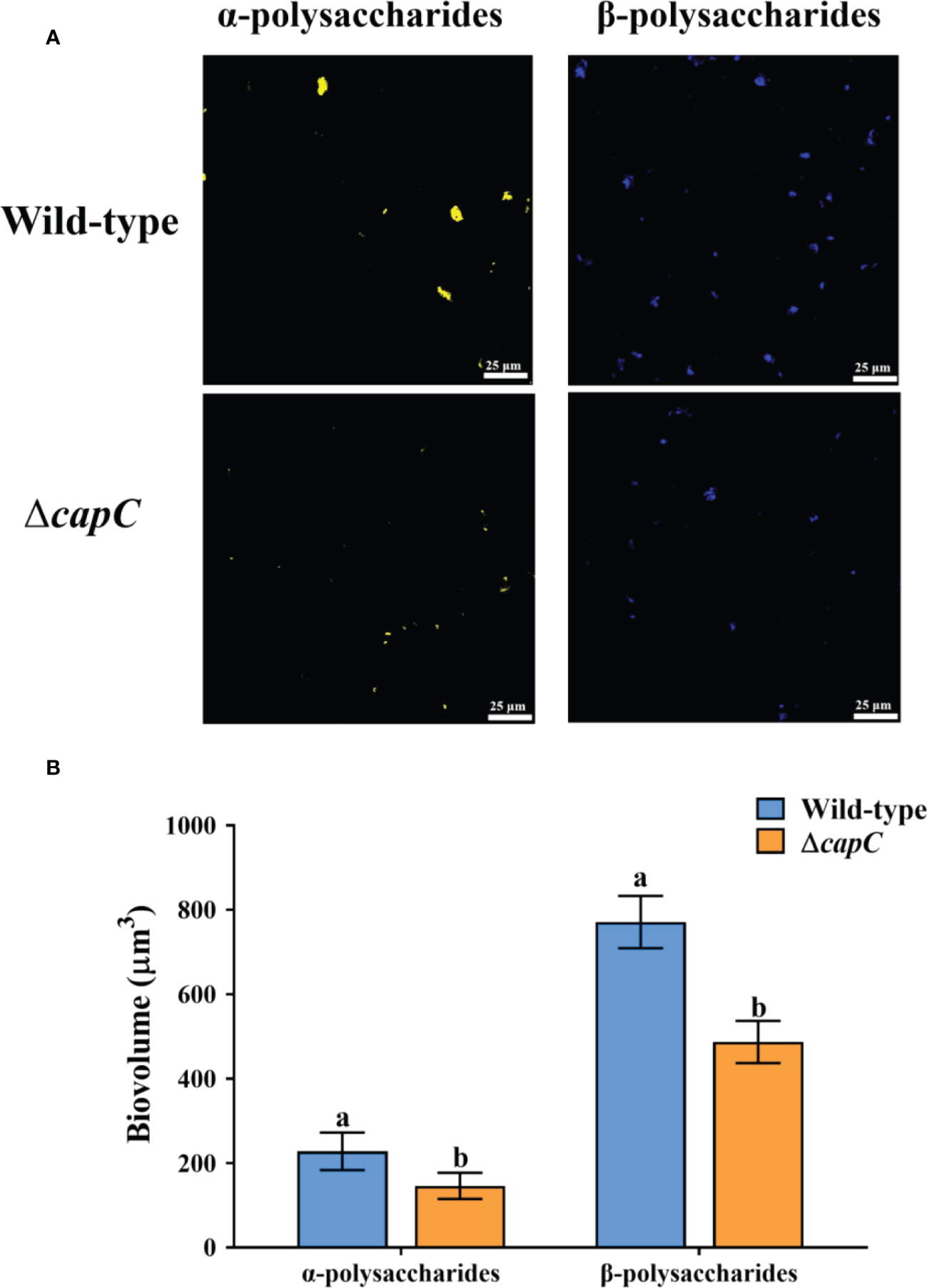 The CLSM analysis of exopolysaccharide in wild-type and ΔcapC biofilms. (A) Distribution of extracellular polysaccharides in two experimental biofilms. (B) Analysis of exopolysaccharide.