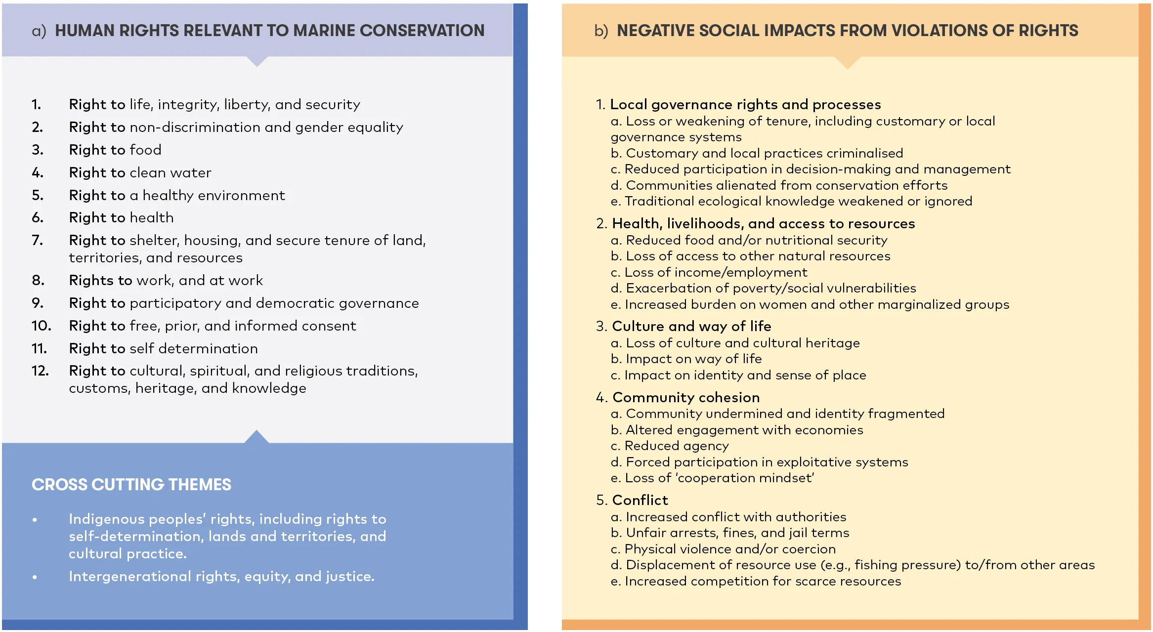 (A) Human rights of strong relevance for marine conservation and (B) the negative social impacts that can accrue from violations of these rights.