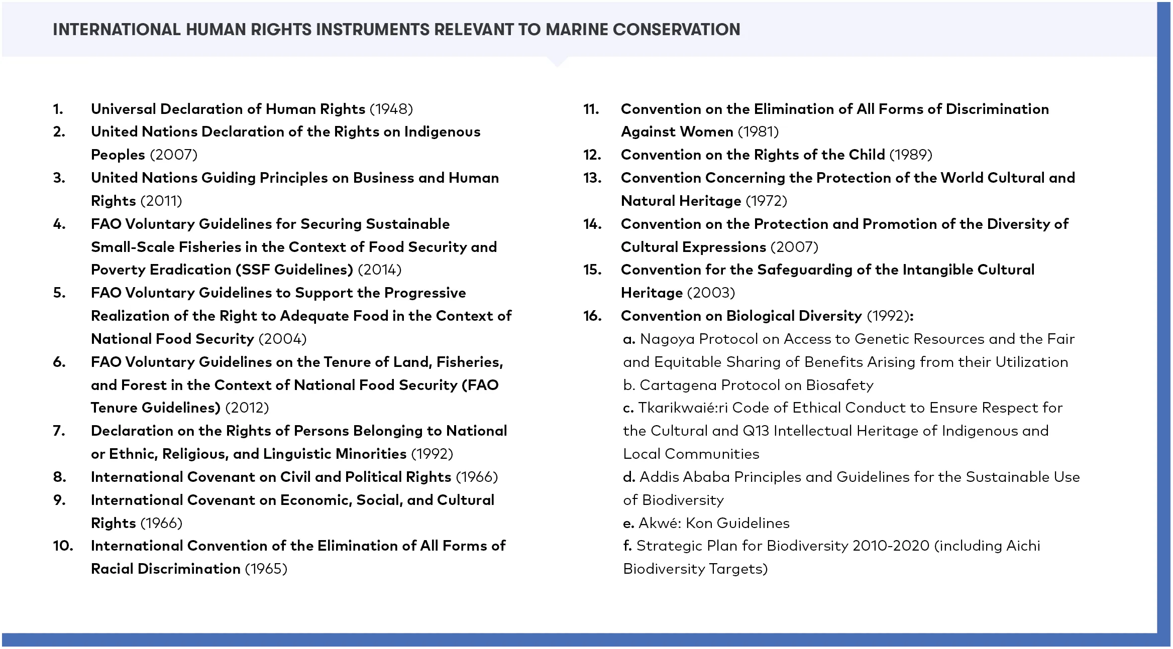 The Universal Declaration of Human Rights, ratified in 1948, includes the right to life (Article 3); freedom from discrimination (Article 7); the right to not be “arbitrarily deprived of his [sic] property” (Article 17b); and the right to adequate standard of living and health, including food (Article 25a). In addition to individual rights there are also collective rights enshrined in legally binding agreements (e.g., International Covenant on Economic, Social, and Cultural Rights, adopted 1966) as well as commitments (e.g., United Nations Declaration on the Rights of Indigenous Peoples, adopted 2007), including: the right of all peoples to determine their own future; the right to own, possess, manage and use ancestral lands and natural resources; the right to participate in the management and conservation of resources on their lands; and more broadly; the right to participate effectively in decision-making in all matters that would affect their rights (Newing and Perram, 2019). Recently, the United Nations General Assembly also declared access to clean and healthy environment a universal human right (U.N., 2022a). Table 1 lists 12 international human rights standards that are of strong relevance in a marine conservation context and the negative social impacts that can accrue if they are violated. Table 2, adapted from Jonas et al. (2016), outlines key international instruments with human rights implications in the context of marine conservation.