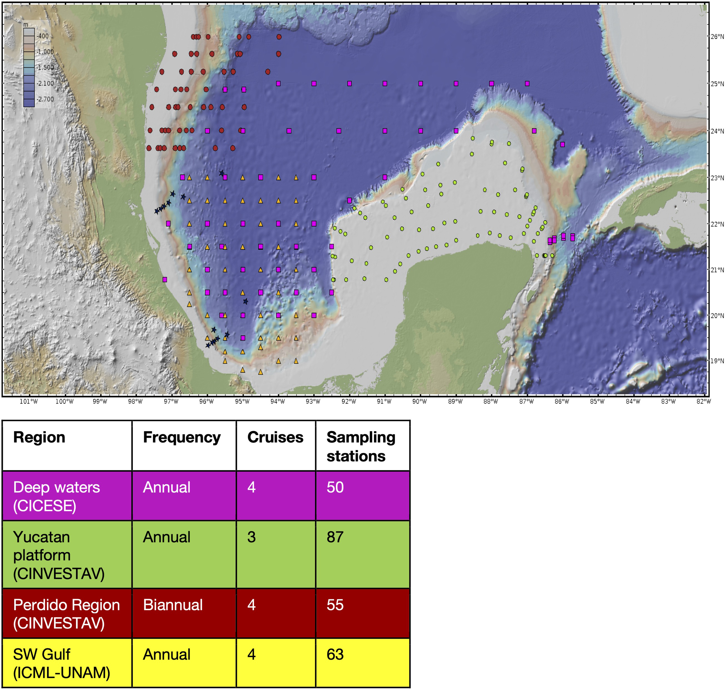 Map of the cruises accomplished by CIGOM in the Gulf of México. Station visited during XIXIMI cruises in the deep water region of the GoM (filled purple squares); location of the stations visited during CINVESTAV-Mérida cruises on the Yucatán Platform (filled light green circles); location of the stations visited during the CINVESTAV-Mérida cruises in the Perdido region (filled red circles); location of the stations visited during ICML-UNAM cruises in the southern GoM (filled yellow triangles).