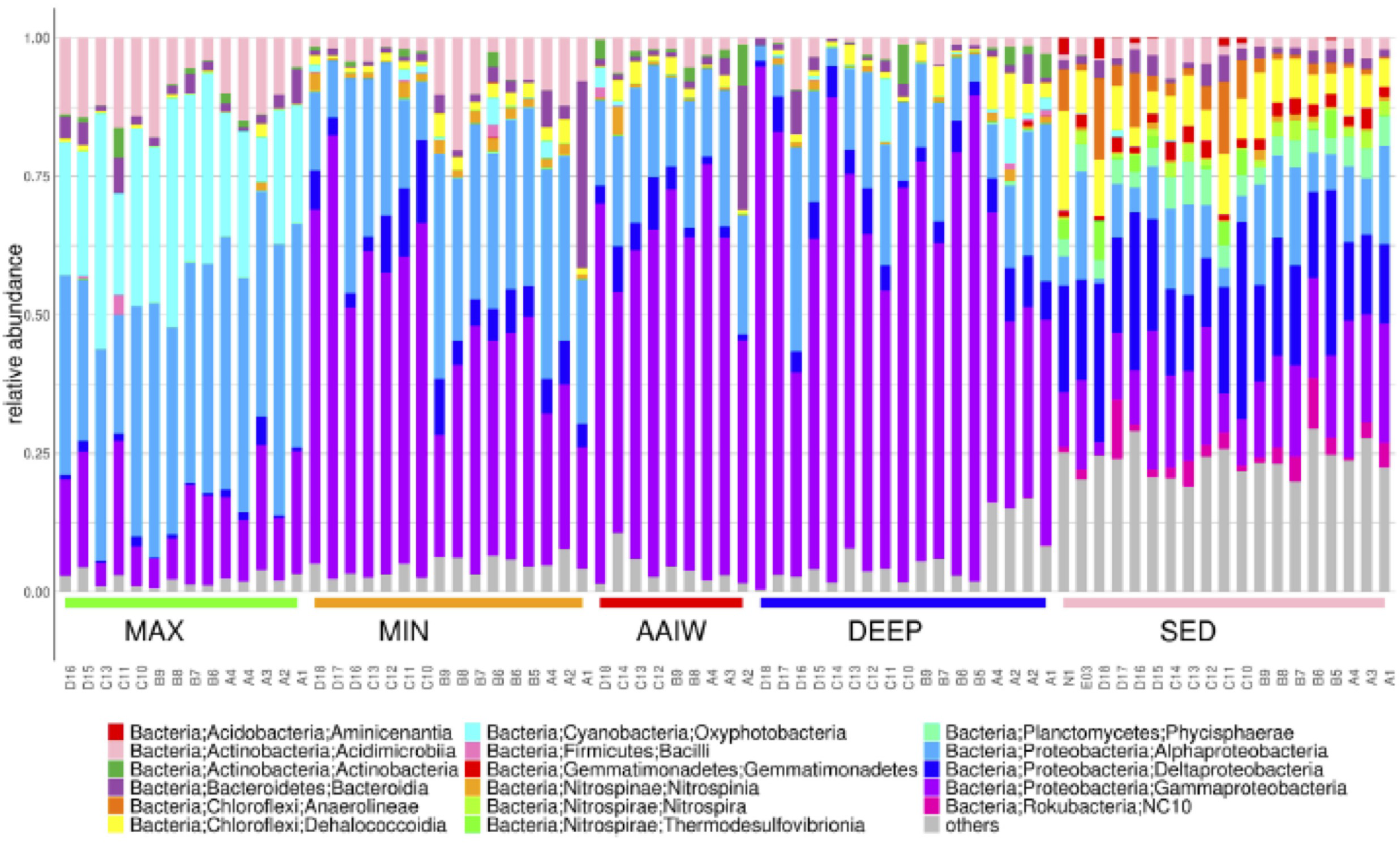 Bar plot of the relative abundances of the 16S rRNA amplicon taxonomic annotations at the Class level. Depth levels of collected samples in the water column in the central western margin (Perdido Region) and the southern GoM, maximum flurescence depth (MAX), relative oxygen minimum (MIN), Antarctic Intermediate Water mass (AAIW), waters below 1500 m depth (DEEP), sediment samples (SEDIMENT). Notice diversity changes with depth through the water column and in the sediments.