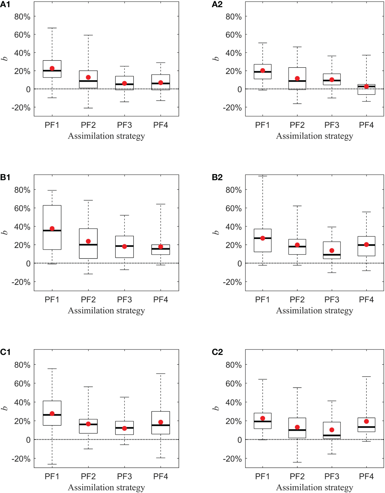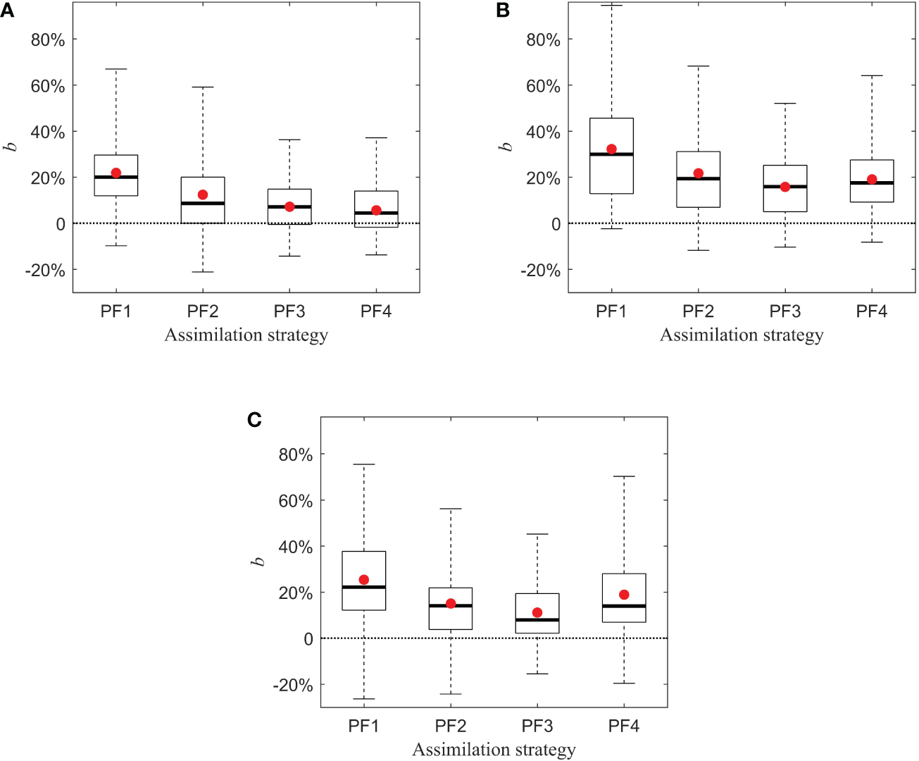 The box plots of b for the PF1, PF2, PF3, and PF4 assimilation strategies using (A) LICOM3 data, (B) GLORYS2V4 data, and (C) AVISO data, with respect to selected eddies and 10 groups of observations for each area.