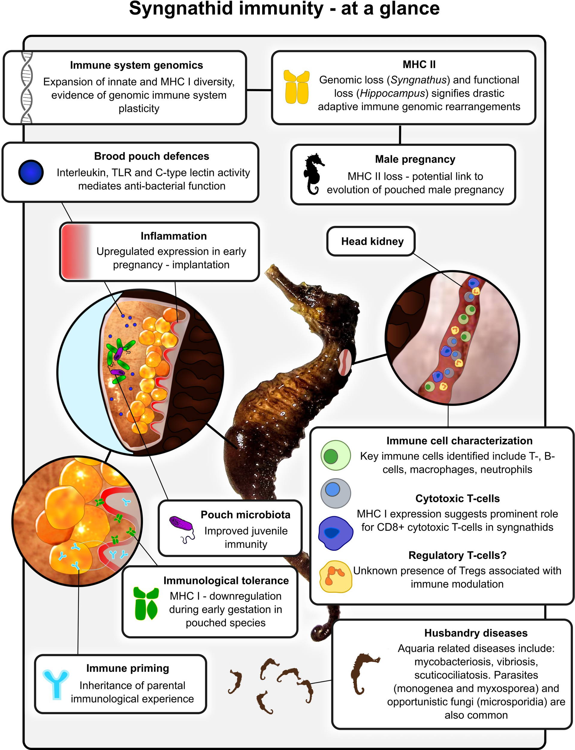 Schematic diagram highlighting some of the key immunological characteristics and research findings associated with syngnathid fishes.