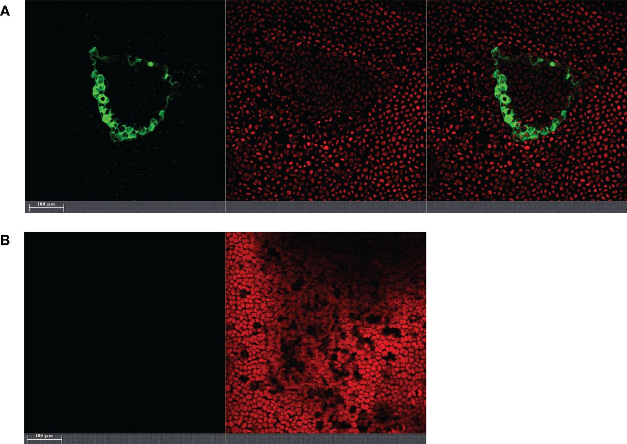 Laser-scanning fluorescence microscopy images of Ulva sp. inoculated with gfp-transformed endophytic PU10 (PU10GFP) 24 h postwashing of inoculation solution. (A)Ulva tissue after introducing PU10GFP isolate. GFP emission at 500–525 nm visualizing the colonization of PU10GFP (left image), emission range of 650–700 nm visualizing autofluorescence of Ulva’s chloroplasts (middle image) and an overlay of both (right image). (B) Control treatment, non-inoculated Ulva tissue (only artificial seawater). Emission range of 500–525 nm showing no GFP (left image) and Ulva chloroplast autofluorescence in emission range of 650–700 nm (right image).