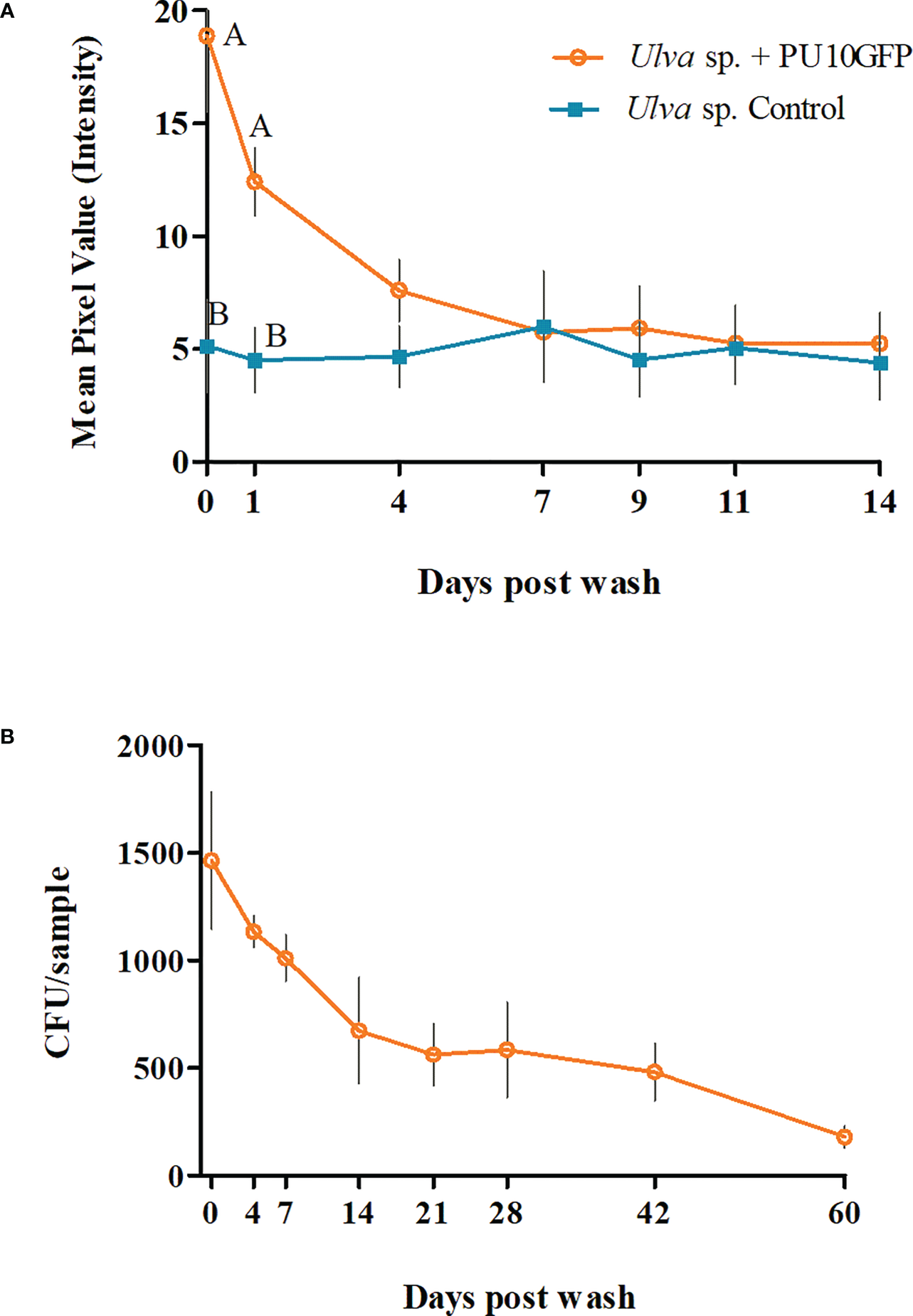 Survival dynamics of endophyte PU10GFP introduced in live fresh Ulva sp. (A) Fluorescence intensity measured as mean pixel value (MPV) of treated (orange) and non-treated (light blue) Ulva sp. during the 14 days of the experiment. Light blue line represents the auto fluorescence received from the algae tissue. Significant differences in fluorescence intensity between Ulva inoculated with PU10GFP and control Ulva on the day of the wash and 1 day postwashing of inoculation solution are demonstrated (P = 0.0254 and P = 0.0193, respectively). (B) Presence of PU10GFP in Ulva sp. tissue, measured as colony forming units (CFU) per Ulva sp. sample (approx. 130 mm2) isolated on antibiotic-amended selective medium over time. Points on curves of both A and B graphs represent average counts and standard error of three experiments.