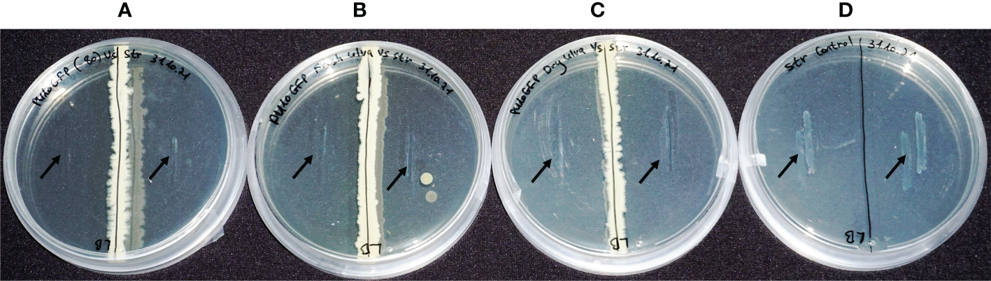 The endophytes from both the fresh (Figure 3B) and freeze-dried (Figure 3C) seaweed were as active against S. iniae as a colony of PU10GFP that was not introduced into Ulva sp. but grown fresh from a stock at -80°C (Figure 3A). Figure 3D presents the normal growth of S. iniae on LB agar after 1 week. The pathogen did not grow on the plates and was not viable postexposure to the endophyte under any of the treatments (data not shown and Deutsch et al., 2021).