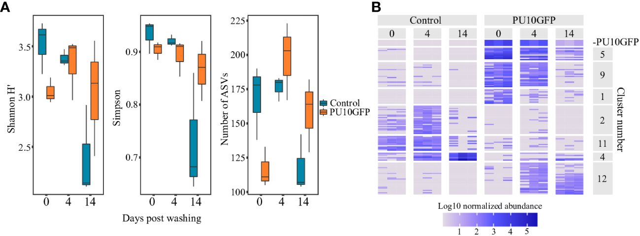 The heat map presents the log10-normalized abundance values of each ASV for each sample on days 0, 4 and 14 postwash. Hierarchical clustering generated 12 clusters with distinct population dynamics. We focused on those best exemplifying certain dynamics (Figure 4B): (a) ASVs showing similar dynamics as the inoculated PU10GFP (cluster 5); (b) ASVs strongly associated with PU10GFP and abundant on day 0, but declining toward day 14 (clusters 1 and 9); (c) ASVs abundant in controls on days 0 and 4 but missing or nearly missing in the PU10GFP inoculation treatment (clusters 2 and 11); (d) ASVs dominating controls on day 14 but not dominant in PU10GFP treatment (cluster 4); (e) ASVs dominating PU10GFP on days 4 and 14 but missing or nearly missing in controls (cluster 12).