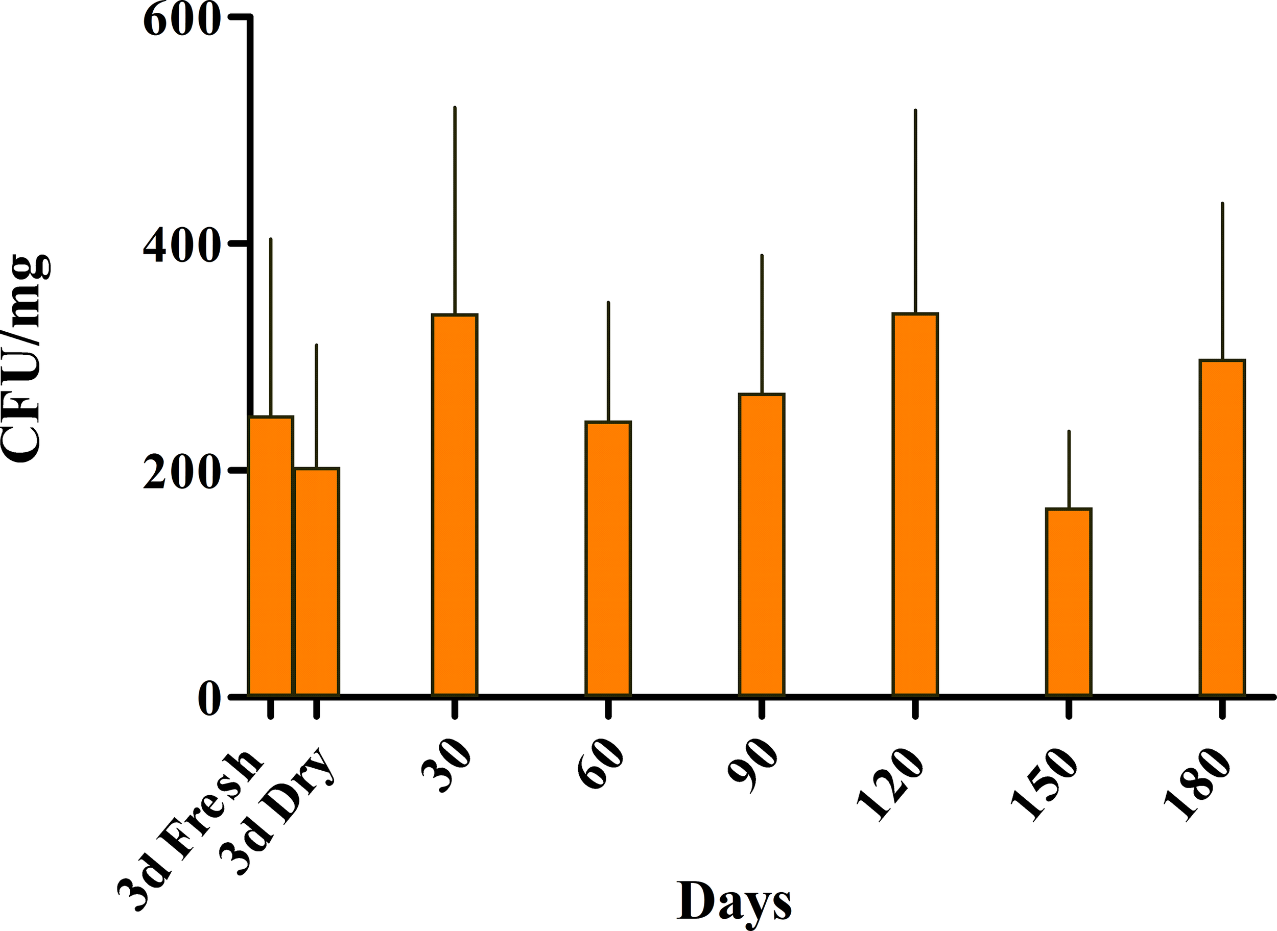 Bacterial numbers (CFU/mg) isolated from the freeze-dried tissue, were recorded for 180 days (Figure 5). The isolated bacteria’s bioactivity was evaluated by their ability to inhibit and kill S. iniae at each time point. We found that the number of PU10GFP was stable and equal to the numbers recorded for both fresh and dry seaweed 3 days postwash (Figure 5). One experiment was continued for more than a year with the same results (data not shown). This supports the notion that, if kept under controlled conditions, the freeze-dried Ulva may be stored for at least a year without losing PU10 as an active endophyte.