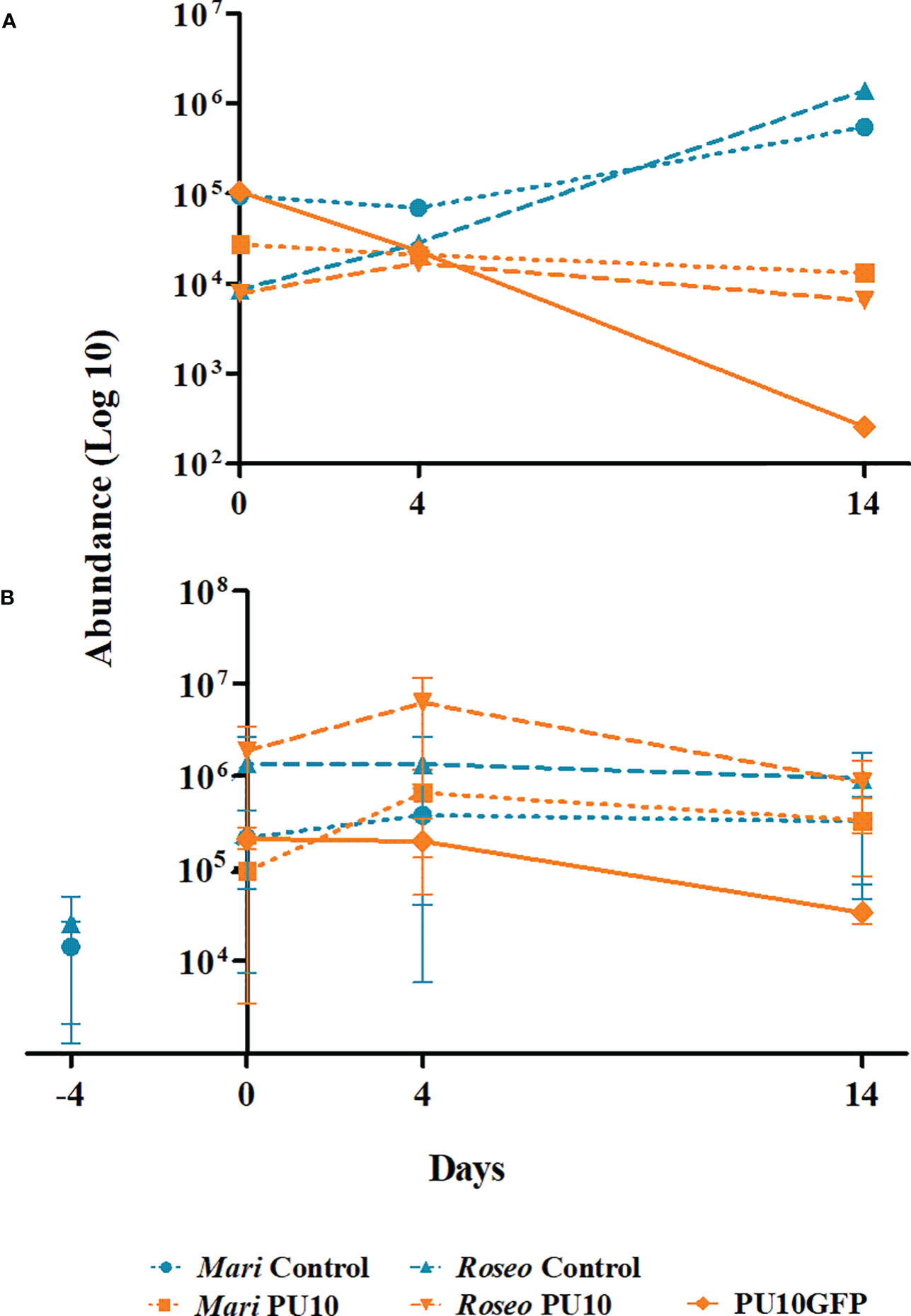 Abundance of PU10GFP, Maribacter sp. and Roseobacter sp. in Ulva sp. as result of PU10GFP inoculation. Control samples (light blue) represent abundance of native Maribacter sp. (Mari control) and Roseobacter sp. (Roseo control) from Ulva thalli in the absence of PU10GFP. Treatment samples (orange) represent abundance of Maribacter sp. (Mari PU10), Roseobacter sp. (Roseo PU10) and PU10GFP from Ulva thalli that were inoculated with PU10GFP. (A) Absolute abundance was determined by using microbiome analysis data (as described in Figure 4) followed by a series of qPCR analyses for the normalized results. (B)Ulva thalli were sampled before inoculation (-4) and then at 0, 4 and 14 days postwash. Absolute abundance was obtained by a series of qPCR analyses for normalized results. Data are presented in log10 scale.