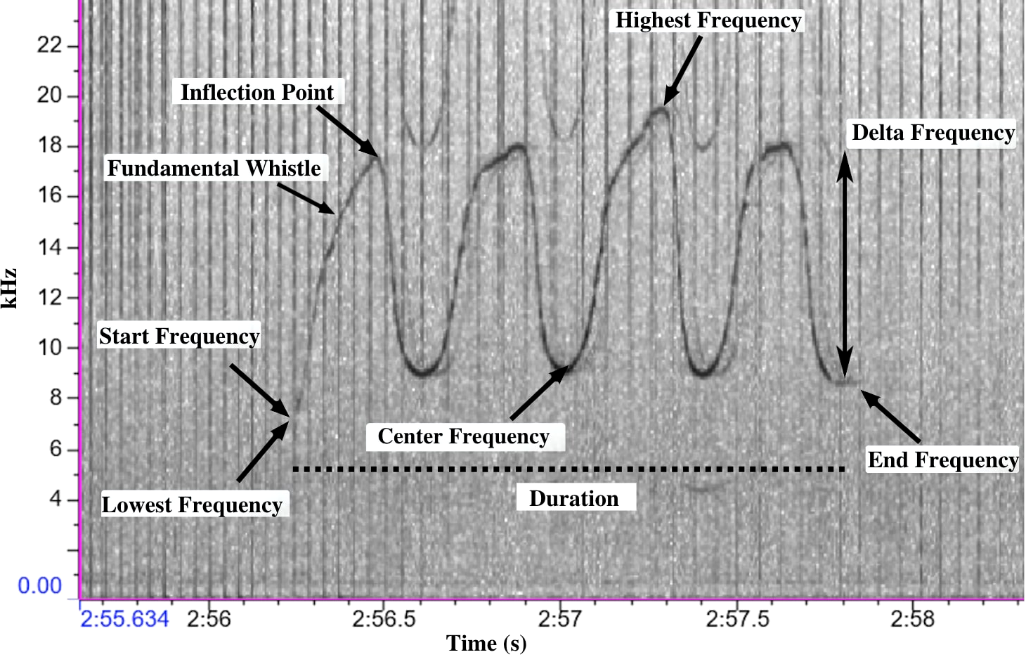 A spectrogram of whistle type F displaying the positions of the whistle parameters measured manually in Raven Pro 1.6.