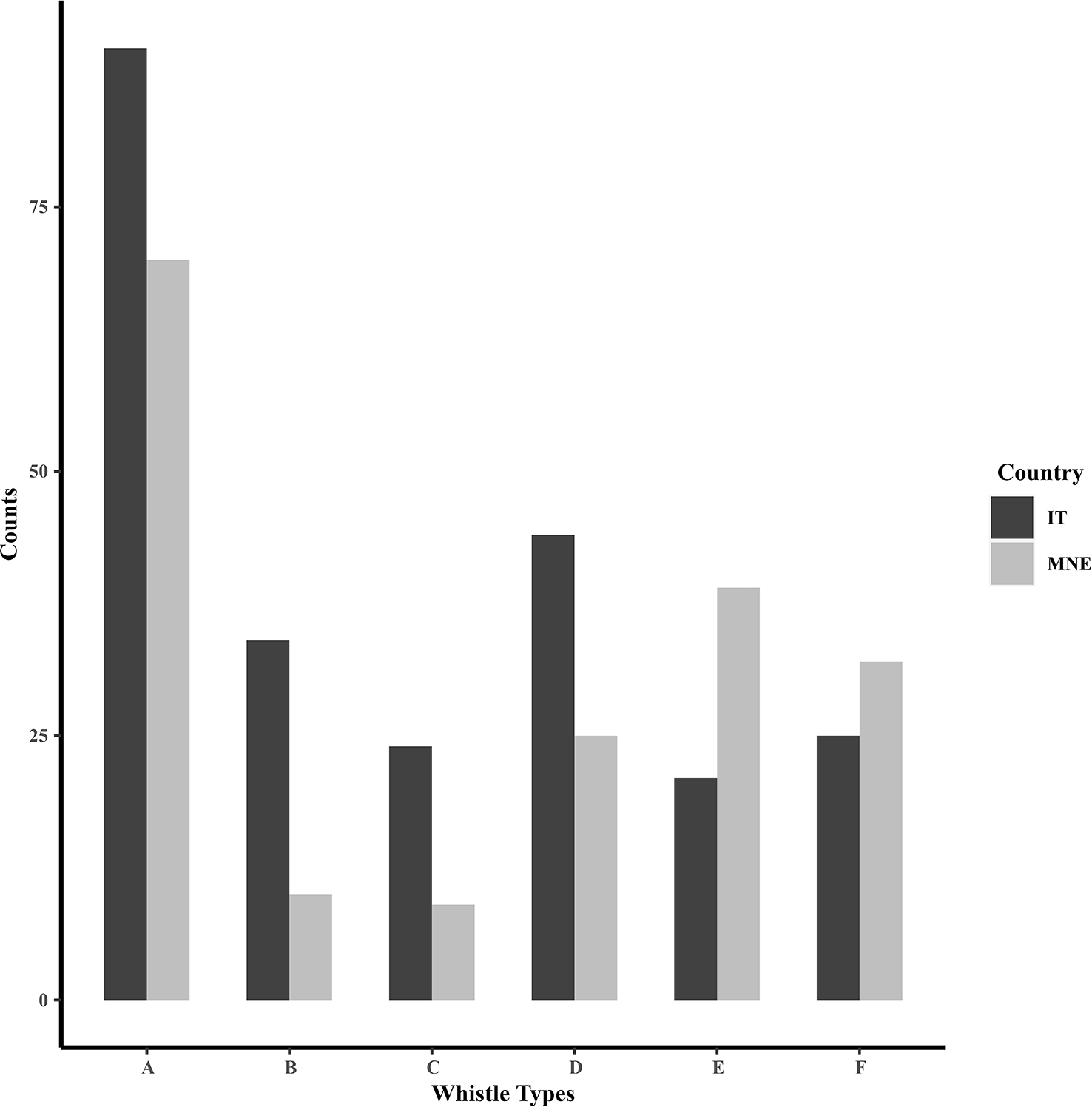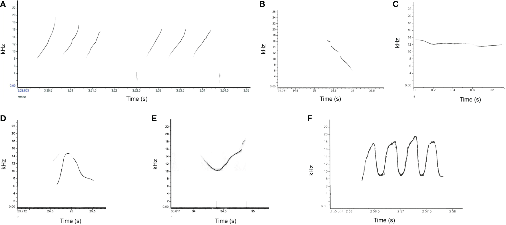 | Whistle Type | The whistle type was categorised by selection of six fundamental contour shapes (Figure 3): (A) upsweep, (B) downsweep, (C) flat, (D) convex, (E) concave, (F) multiloop |
