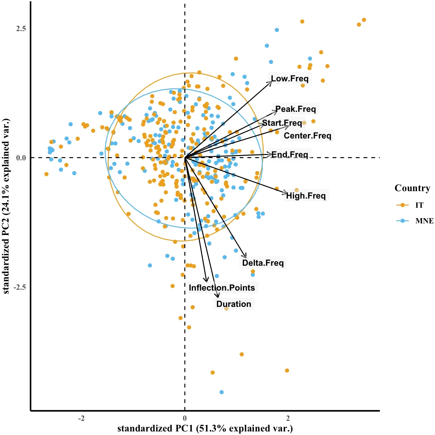 PCA correlation biplot of the whistle parameters grouped by the study location (IT = Taranto Gulf, MNE = Boka Bay) with 95% confidence interval ellipses.