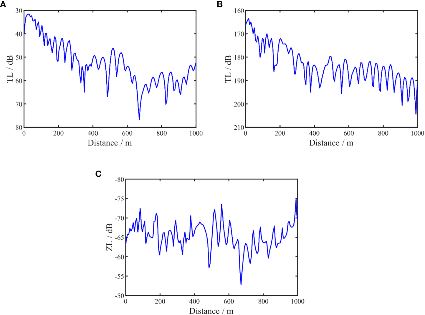 Figures 2A–C show the propagation characteristic curves in Table 1 for the p, vz and Zz, respectively. The transmission loss curves TLp and TLvz are used to describe the propagation characteristic of p and vz, and the waveguide characteristic impedance curve ZLZz is used to describe the propagation characteristic of Zz. These curves are defined by Equation (22) (Zhu, 2014).