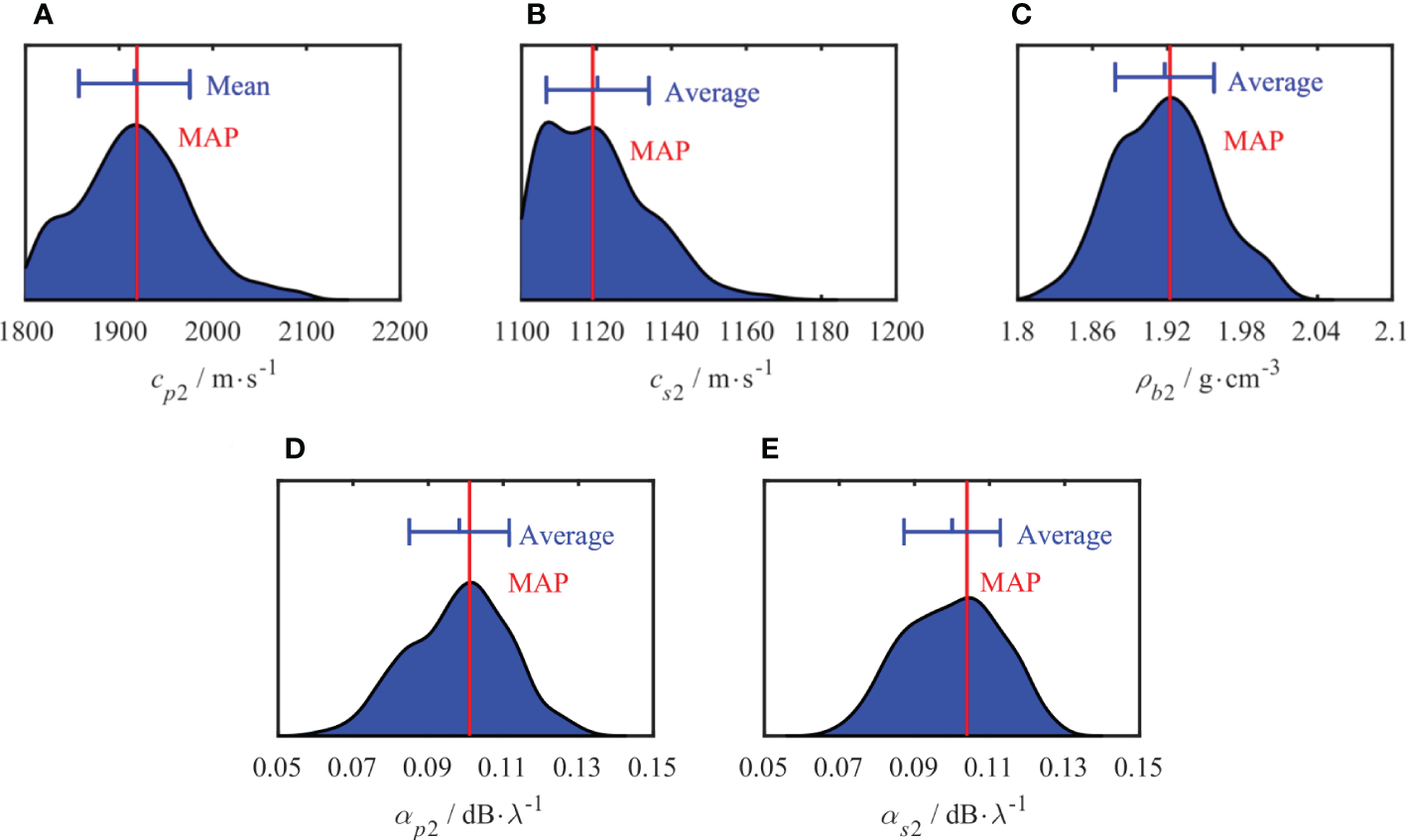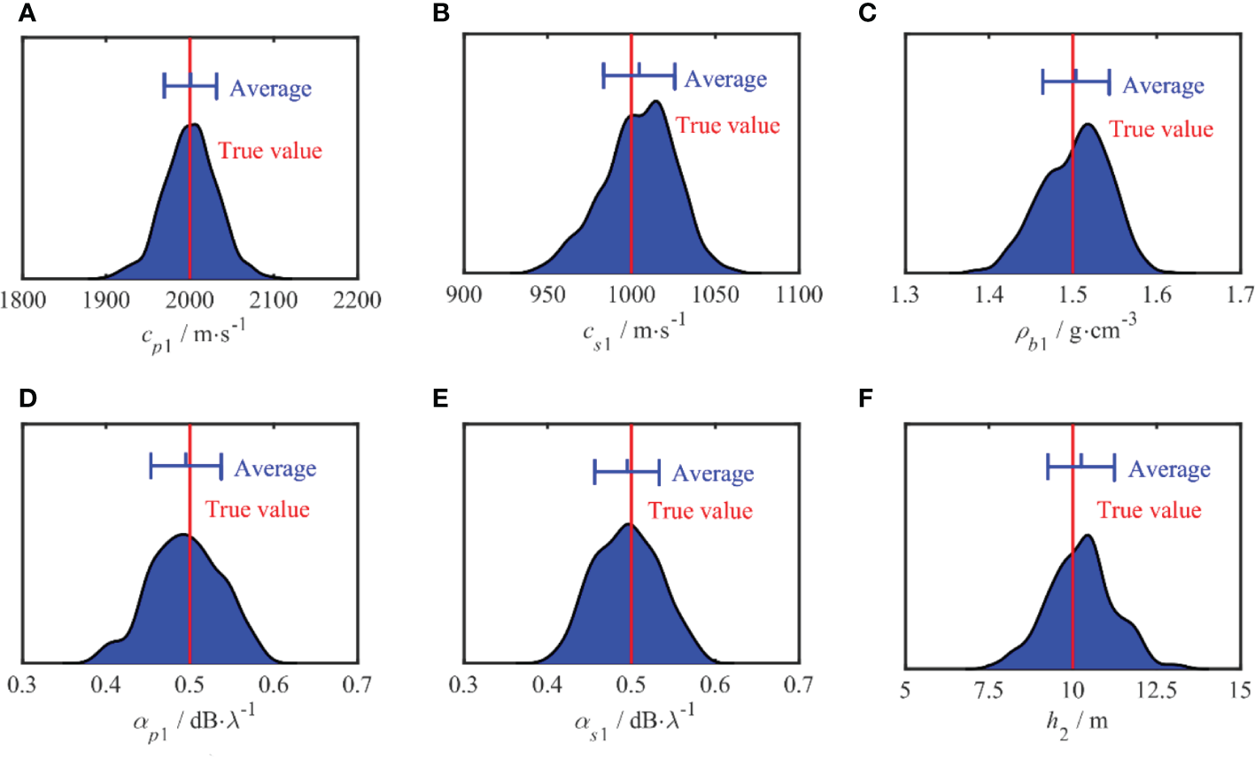 Figures 7 , 8 show the PPDs of the inverted geoacoustic parameters in the sediment layer and semi-infinite basement, respectively. In each figure, the vertical axis represents the probability of each parameter and the red line represents the true simulation value of each parameter. The average value and standard deviation of the inversion results are represented by the blue segment, with the average value shown in the center. The length of the blue segment reflects the standard deviation of each parameter. The PPD distribution range characterizes the uncertainty of each parameter. It can be seen from the results that the maximum probability density of each parameter is close to its true value. The uncertainty of the inversion results for each parameter is consistent with the results of the sensitivity analysis.