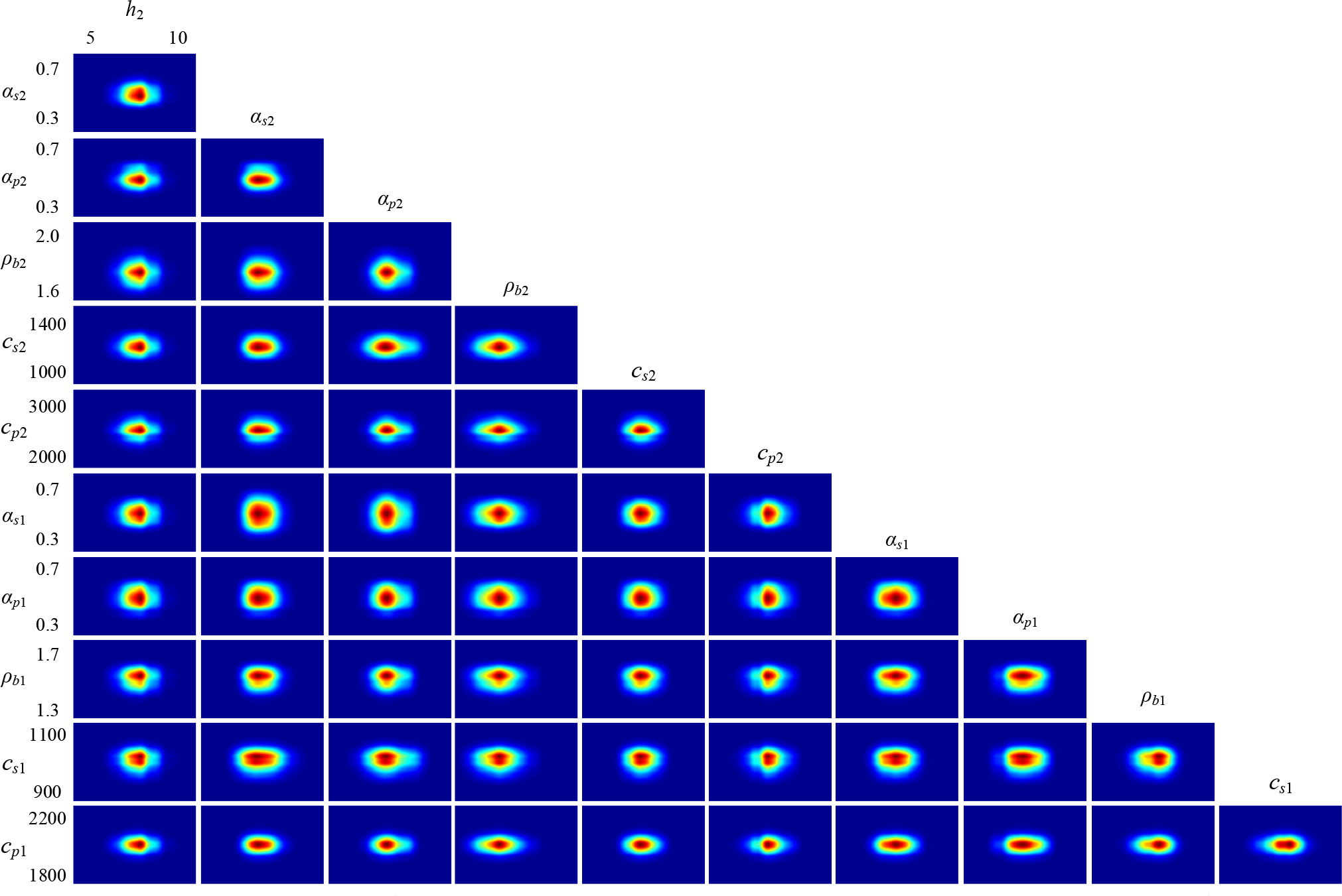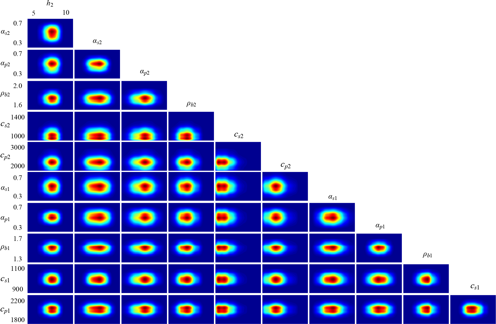 The marginal probability distribution between the two parameters is shown in Figure 9, which shows the uncertainty of the joint parameters. From the figures, it can be seen that the centralized probability density distributions characterize lower uncertainties, and all true values are close to the highest probability of PPD. The results combined with the sound speed attenuation have a broader distribution, the results combined with αs2 and αp2 are more distinct, and the span in the attenuation direction is larger. In conjunction with the analysis of the inversion accuracy of each parameter, it can be seen that, the sound speed attenuation has little effect on the theoretical acoustic pressure field in the process of matching inversion. Therefore, many results that deviate from the true value are retained, resulting in a more comprehensive distribution range.