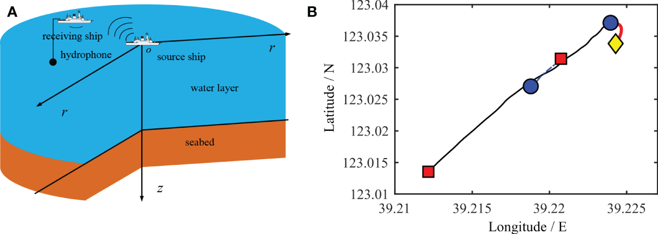 Schematic diagram of the experimental configuration, the deployment of the source ship and receiving ship (A) and the longitude and latitude of the distance between the two ships (B).